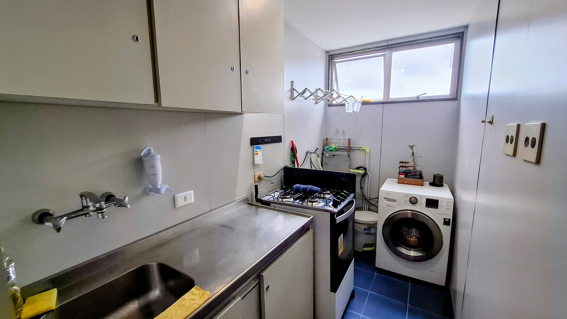 Fully equipped with stove, oven, refrigerator, freezer, microwave, blender, toaster, utensils, and a washer-dryer.