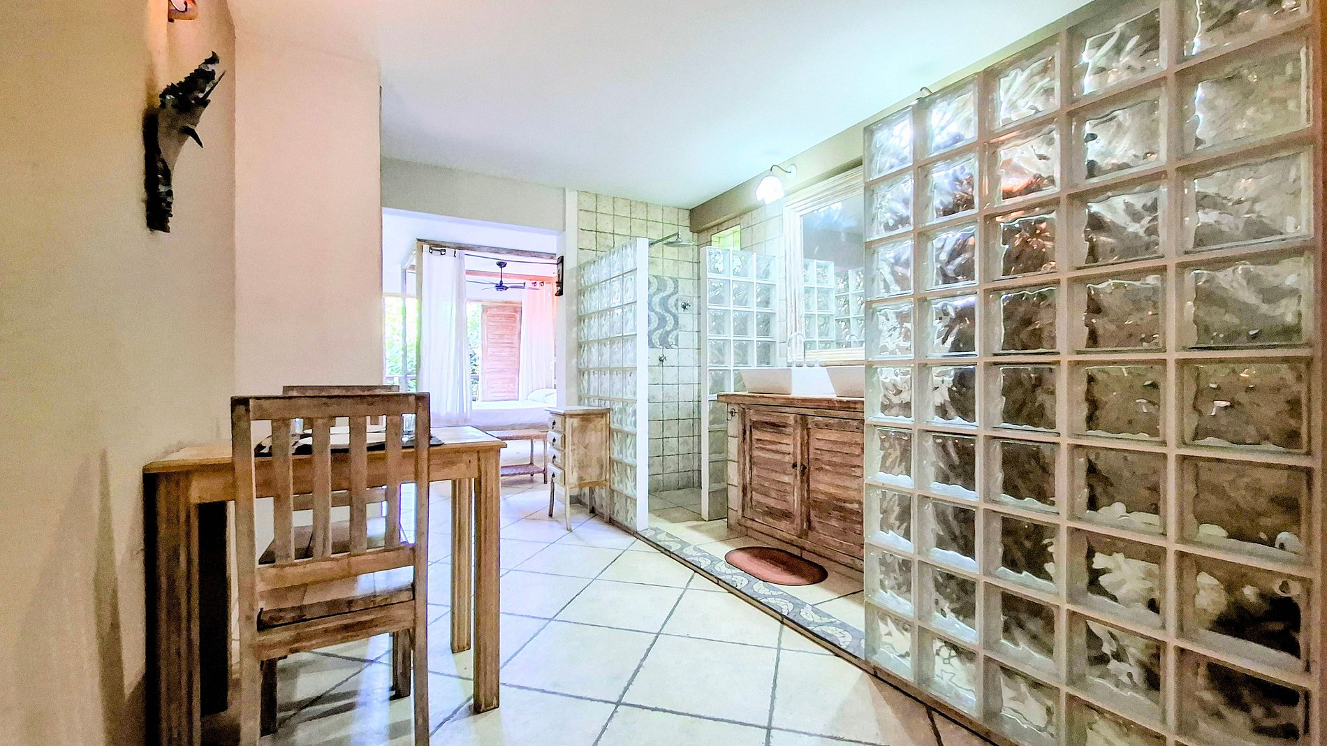 A dining table allows for sharing moments with family and friends. Access to the large balcony is ideal for relaxing, reading, or enjoying the environment.