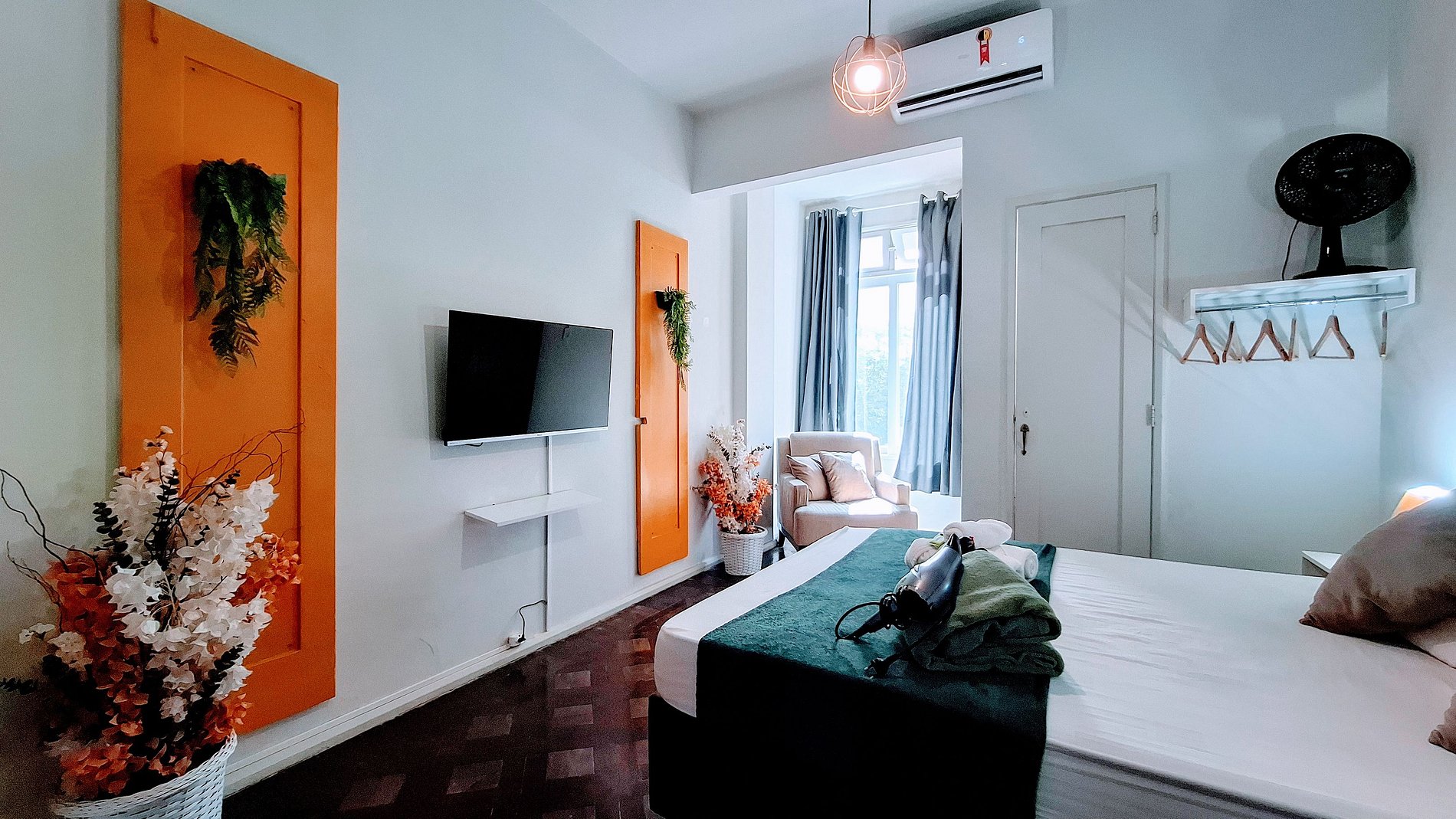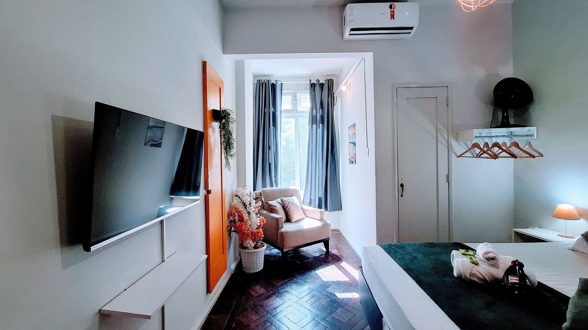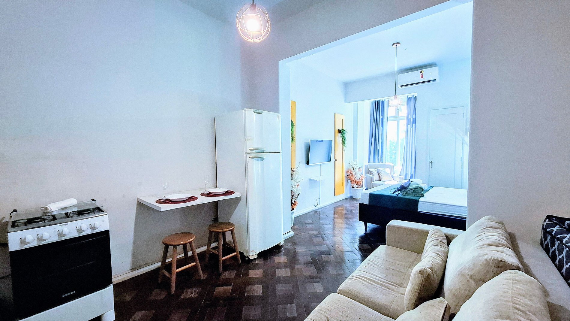 With the delivery of the keys gives you total freedom to enter and leave when you want. Enjoy a comfortable double bed and a single futon mattress. Bedding and bath smells and quality are included. To organize your little things, a functional closet awaits you. The air conditioning ensures freshness on sunny days. The TV is ready for your moments of relaxation, and the blackout curtain invites you to an invigorating sleep. Iron and hair dryer are your allies to always stay impeccable. In the full kitchen, you will find everything to prepare your meals with convenience. The bathroom has a shower and hot gas for a relaxing bath.