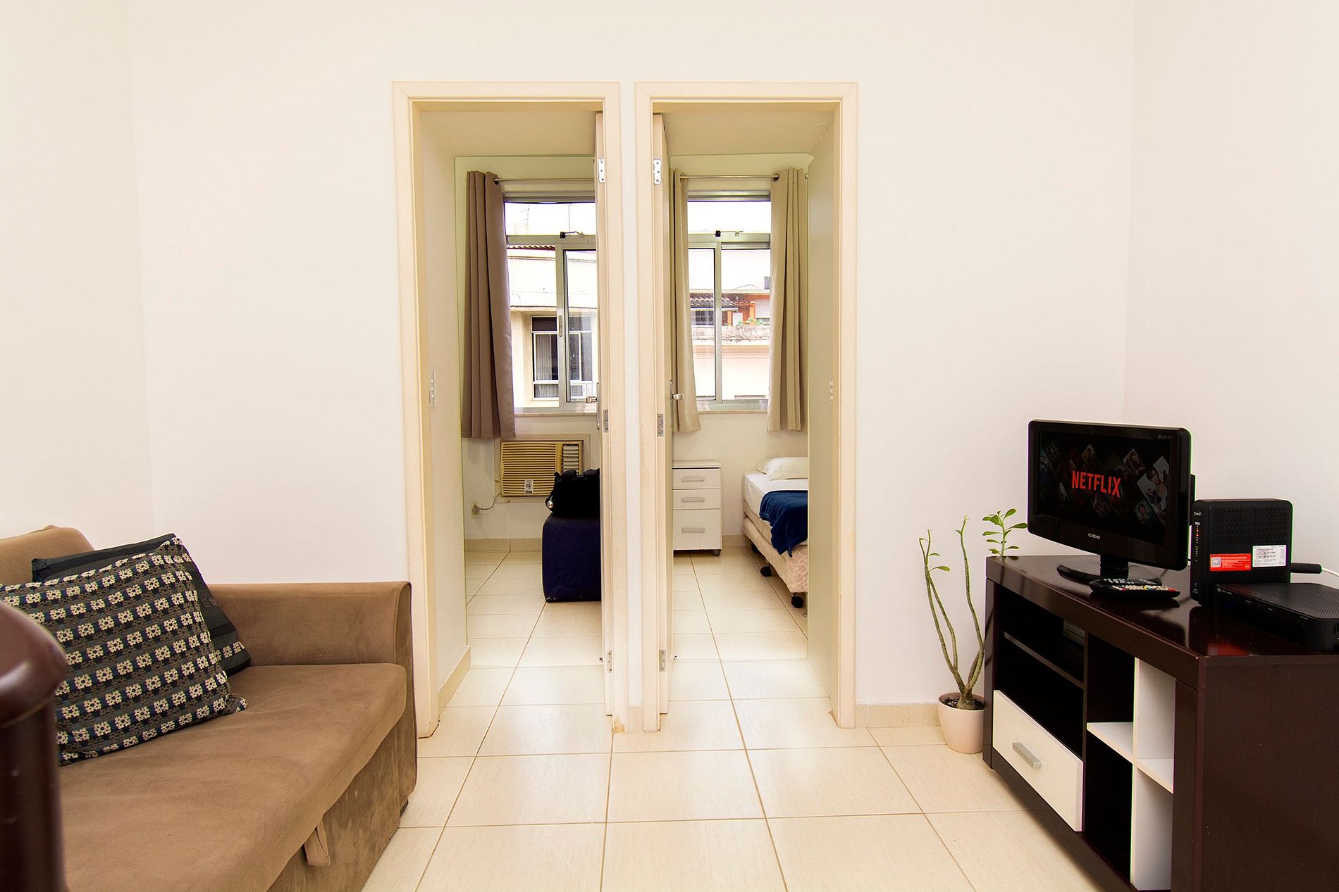 It has 1 double bed, 2 single beds, 1 of them set inside the other, 1 sofa, cable TV, Wi-Fi, air conditioner, electronic locker, household items and hot water.