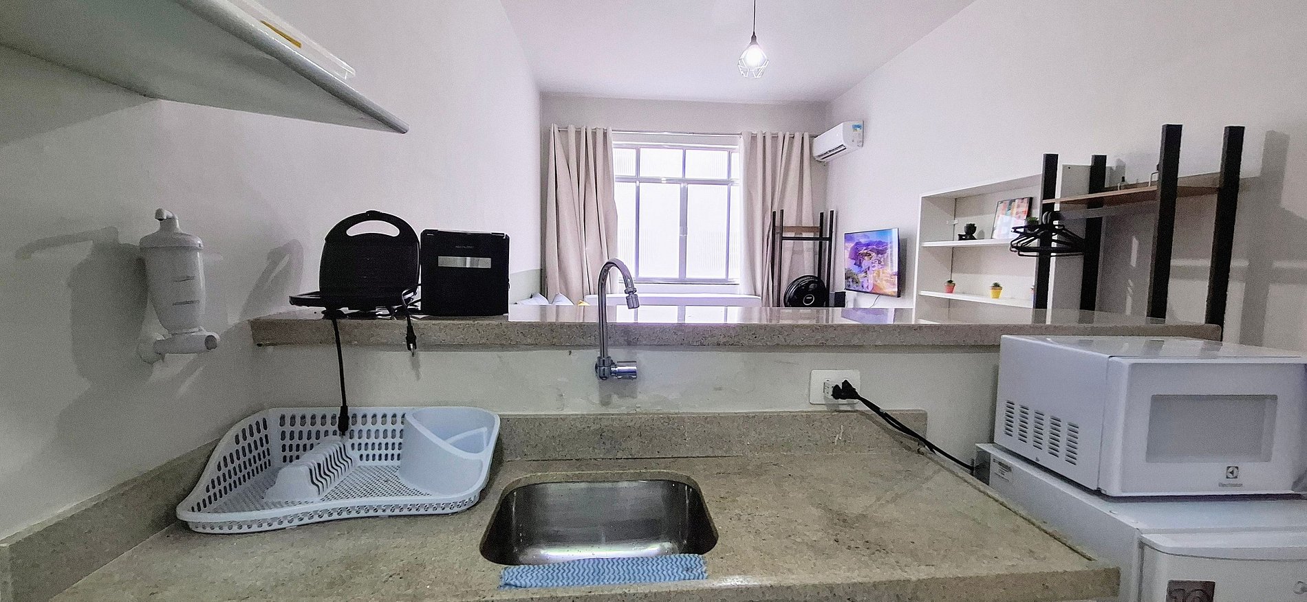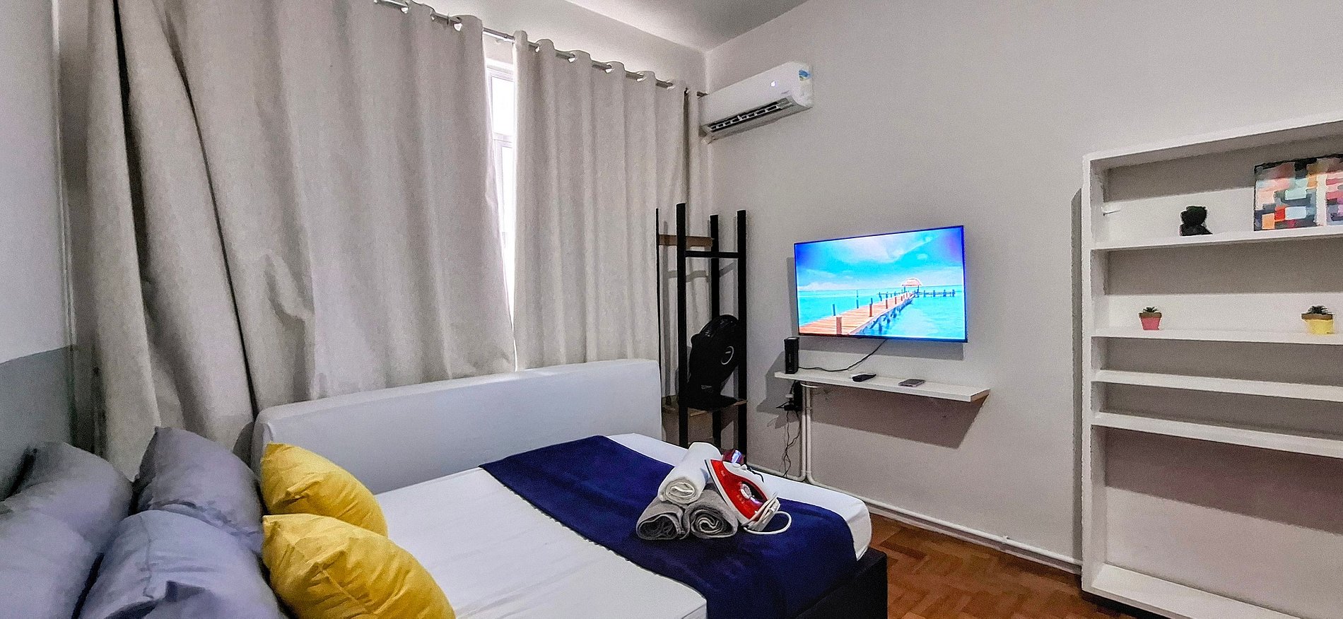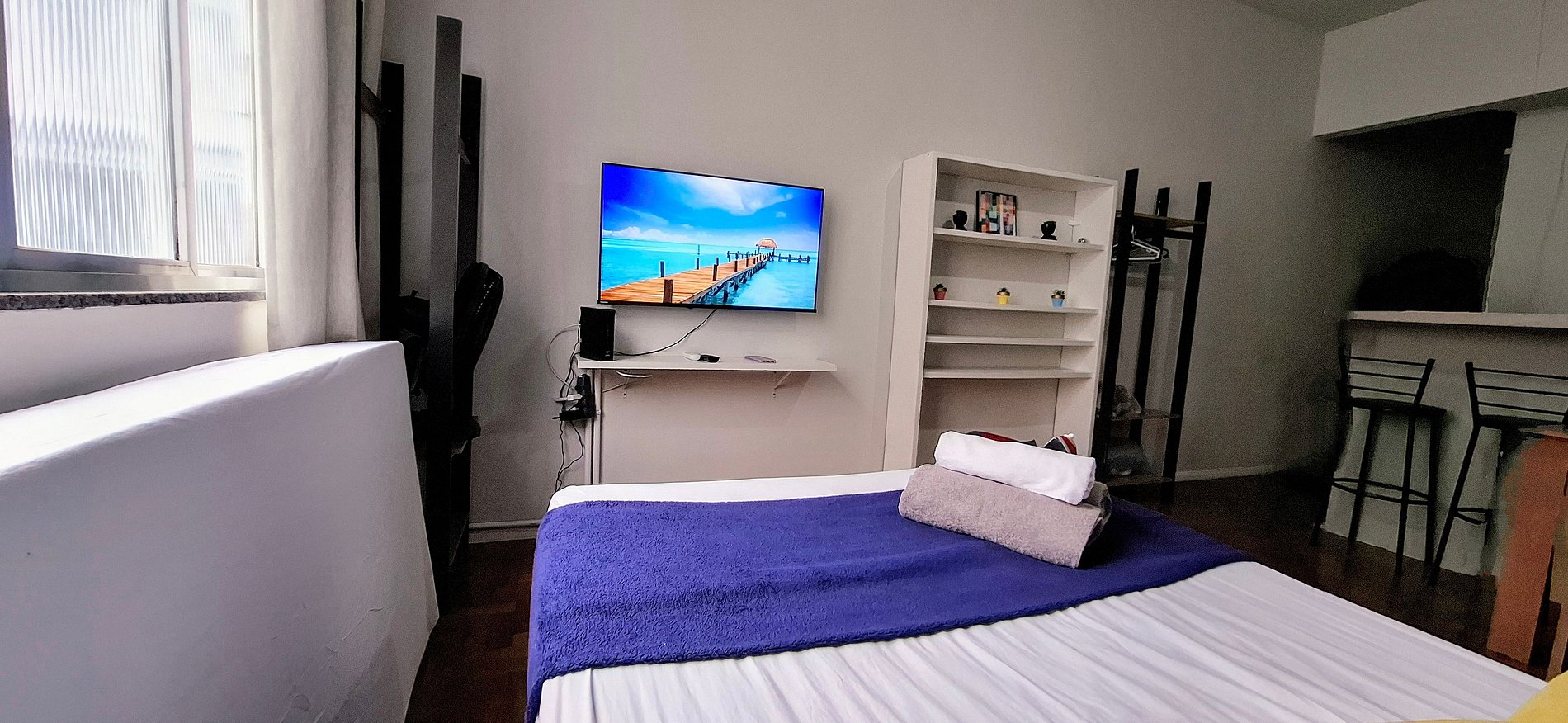 Our cozy apartment, with bedroom-living room, kitchen and bathroom, is on the 10th floor (deep view) and is less than 10 minutes from the beaches of the south zone and Glória.