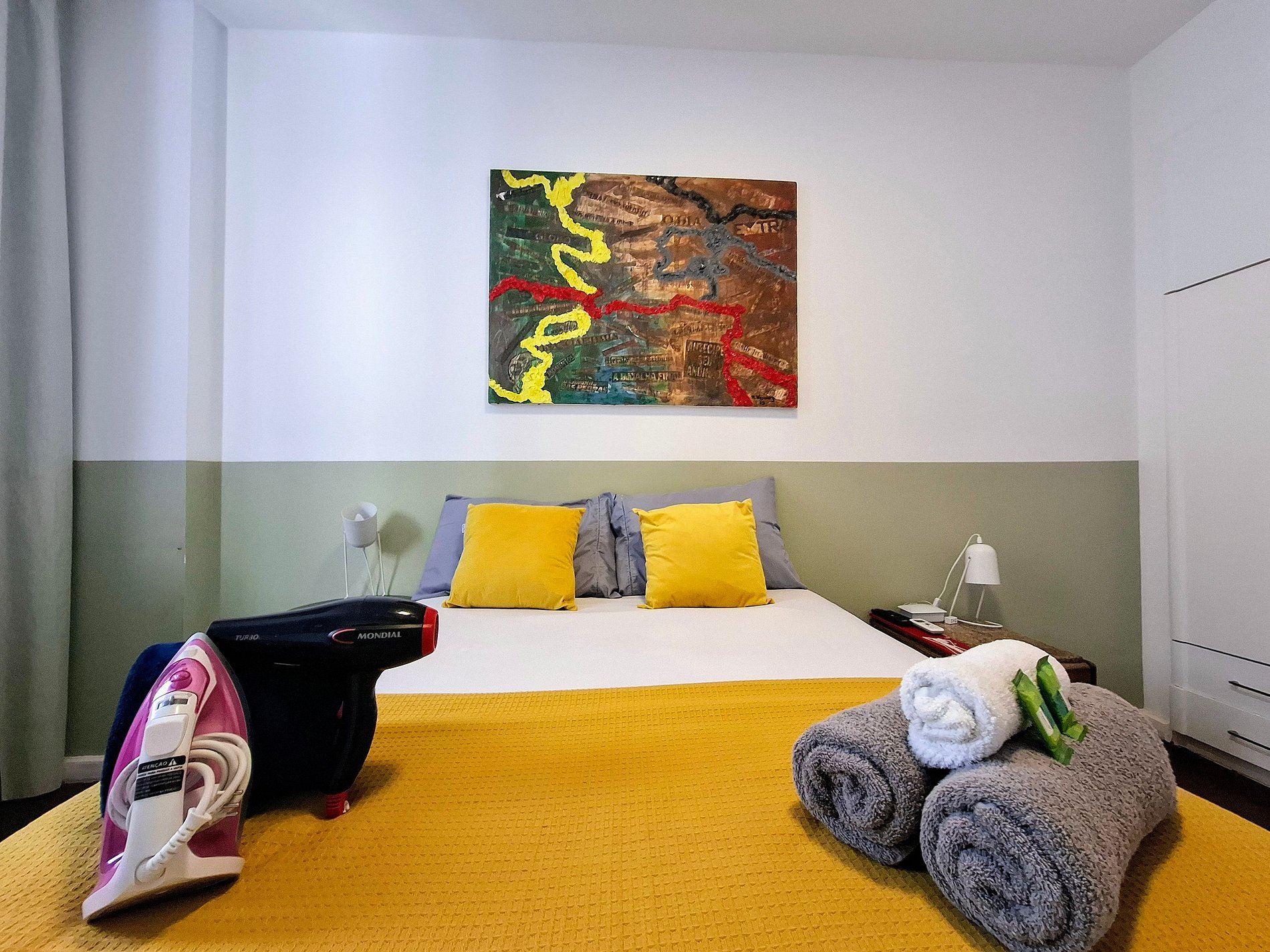 The residential building has an elevator and a peaceful neighborhood. Inside, it is bright and decorated with modern touches: a master suite with a king-size bed and soft linens, an extra bedroom with a workstation, a living room with a flat-screen TV, and a balcony with a green view. A fully equipped kitchen and a laundry area with a washing machine complete the experience. Nearby, you’ll find supermarkets, pharmacies, and public transportation.