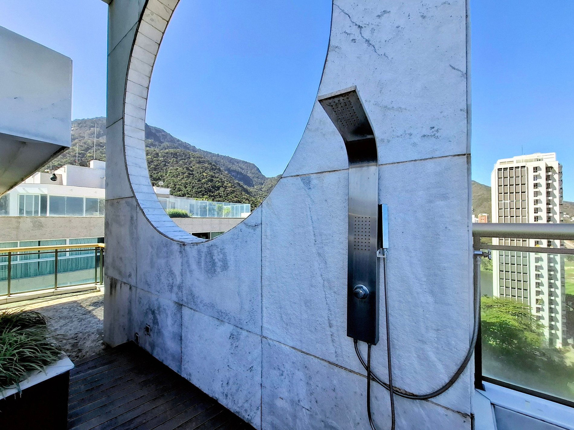 El balcón es uno de los grandes atractivos: un espacio amplio y ventilado con una vista deslumbrante al mar de São Conrado, perfecto para un desayuno especial o una copa de vino al atardecer. Todo fue planeado para recibir hasta cuatro huéspedes con confort y estilo.
