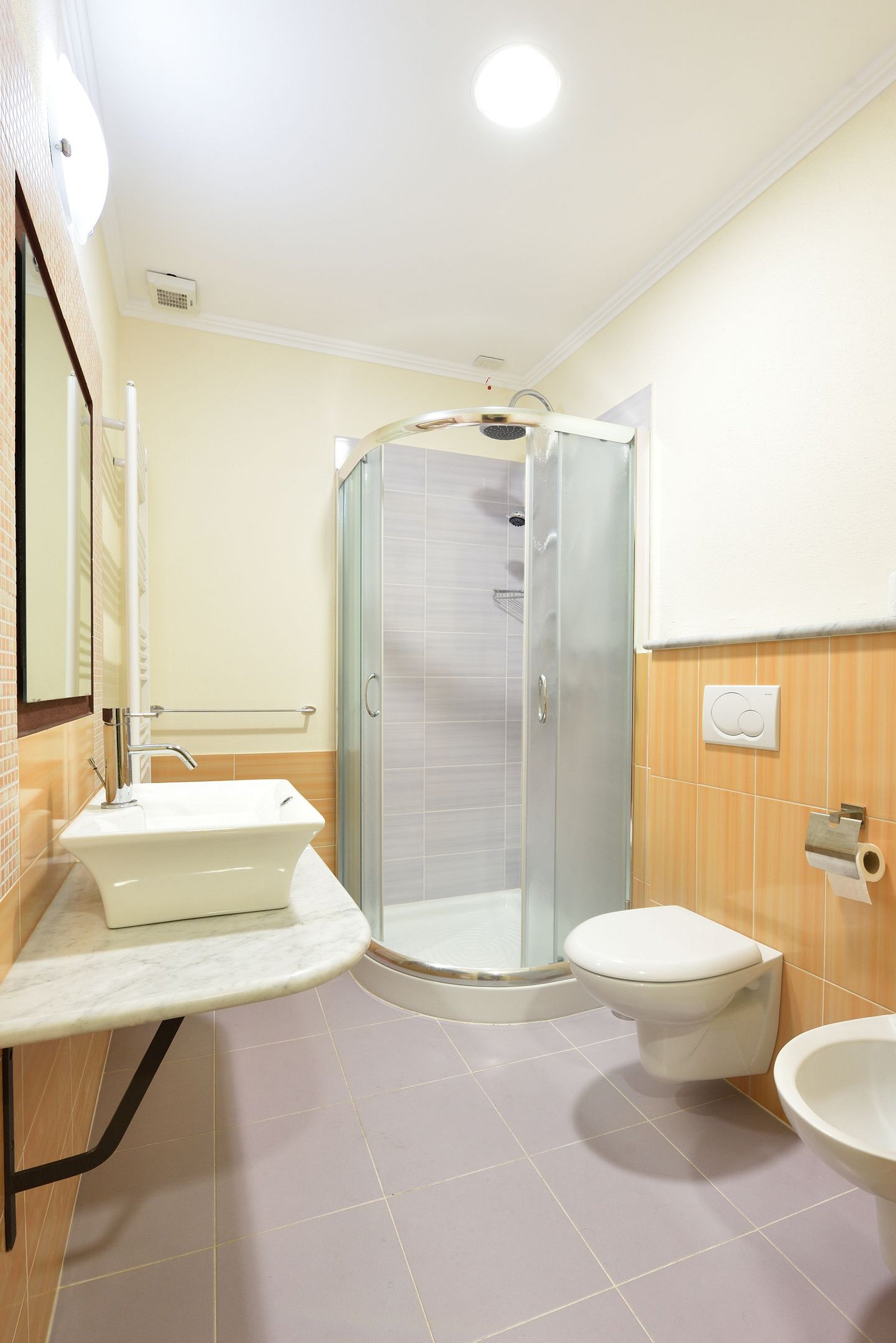 Privado, con ducha, espejo, artículos de higiene y secador de pelo. Revestimientos que respetan la identidad histórica de la casa-museo.
