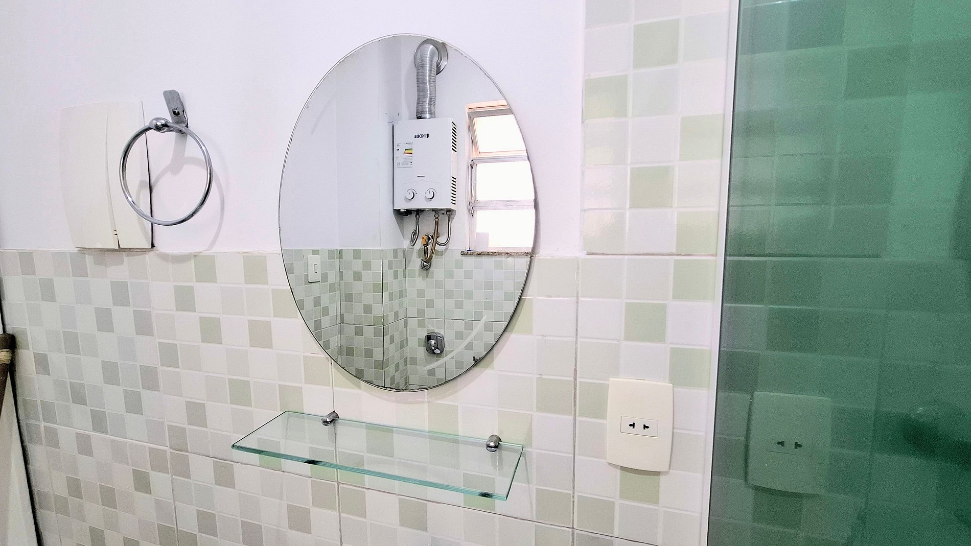 Baño social con ducha, espejo y artículos de higiene. Mantenimiento realizado por el equipo Yes Temporada.