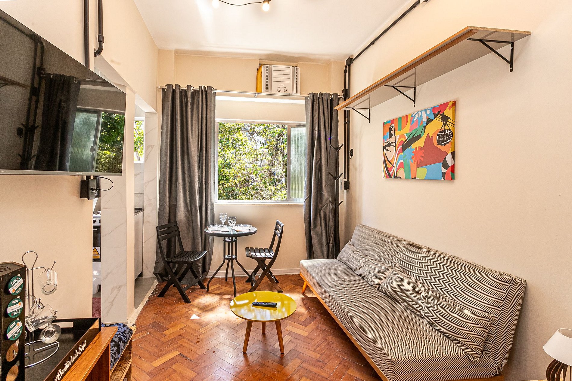 Capacidad para hasta 3 personas, con una cama queen en el dormitorio y un sofá cama en la sala de estar. La Smart TV con canales por cable ofrece entretenimiento.