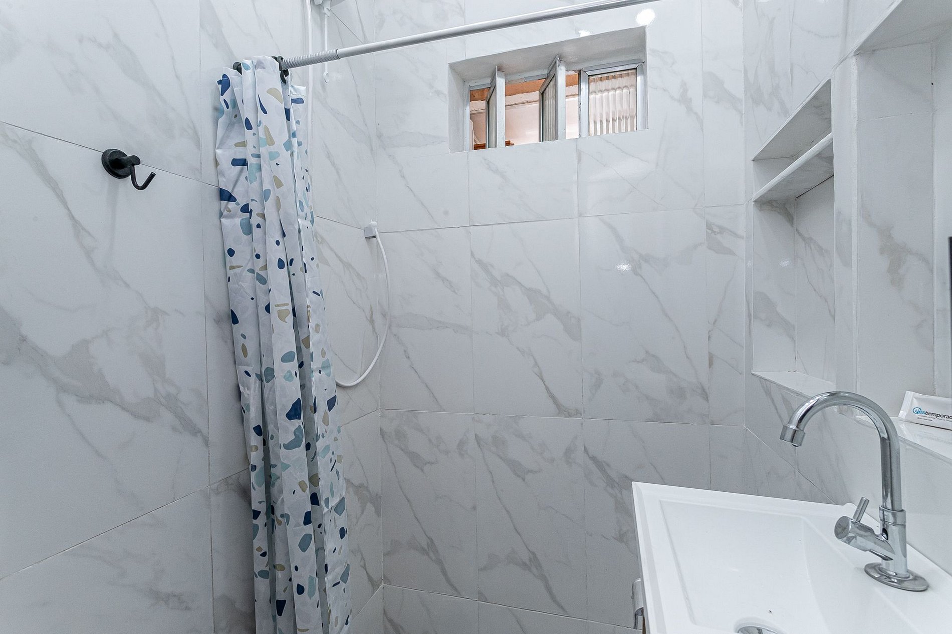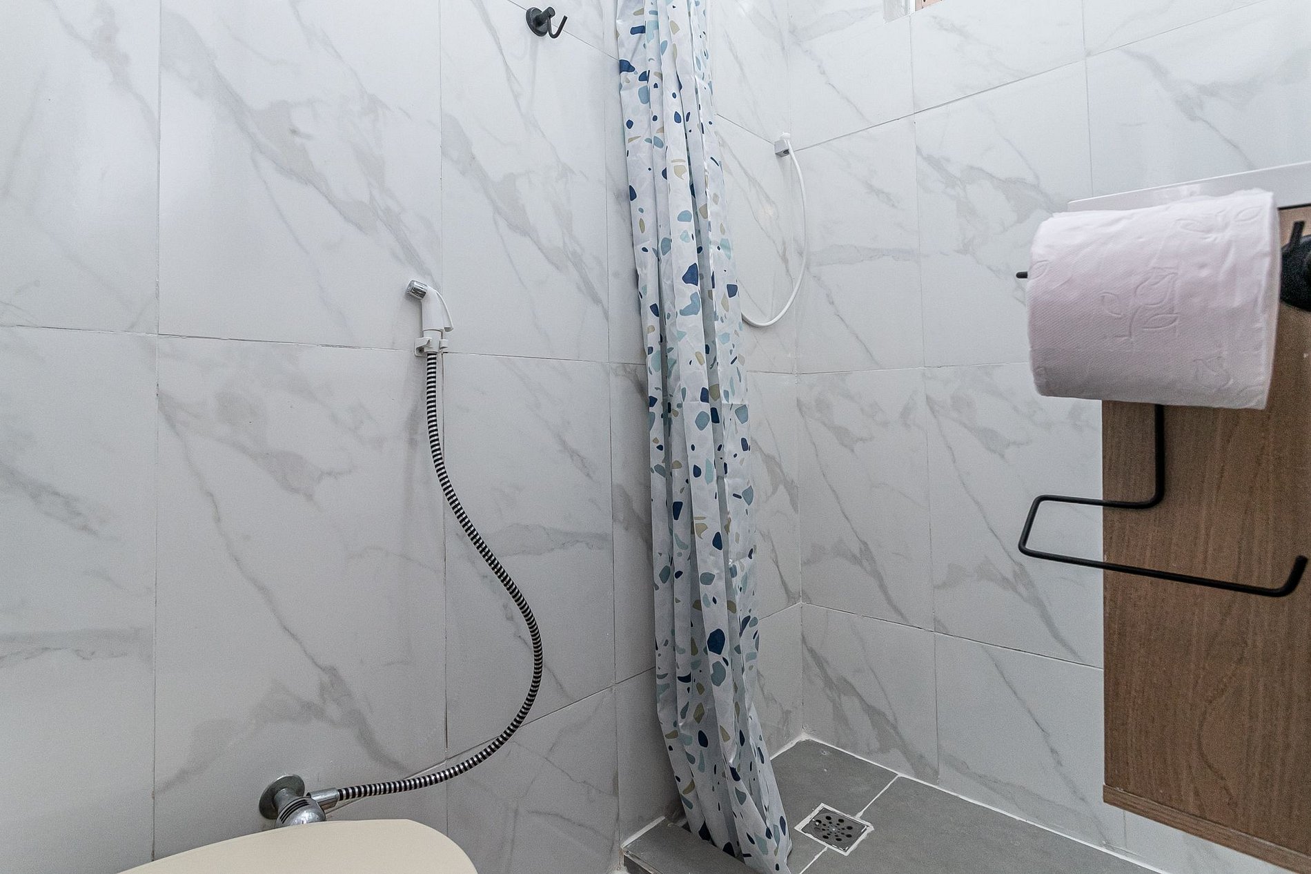 El baño completo dispone de ducha a nivel del suelo y proporciona elementos esenciales como jabón, toallas, papel higiénico y agua caliente disponible en todo momento.