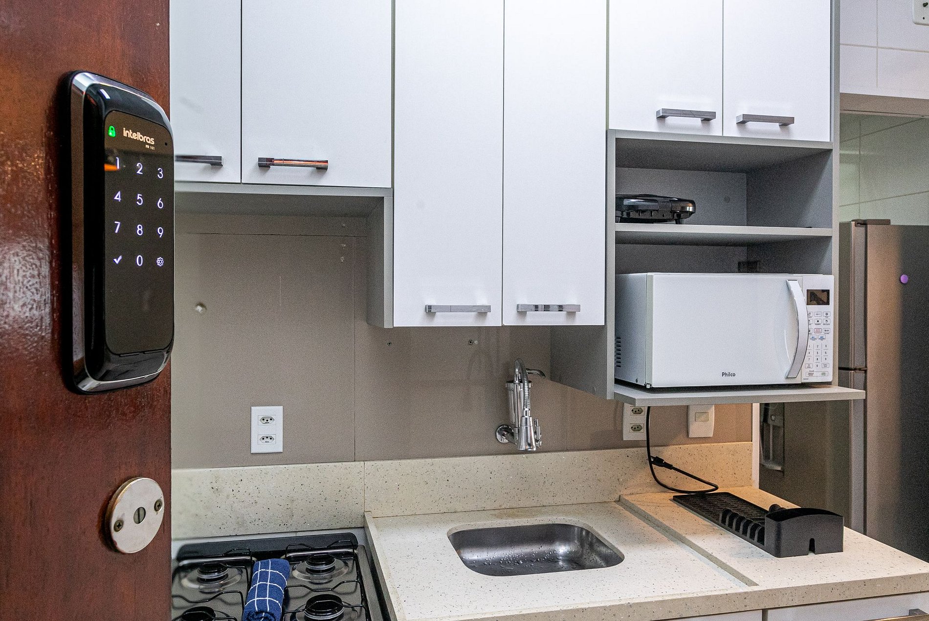 Sala: 1 sofá cama.Smart TV con canales de cable ofrece entretenimiento. El baño está completo, con ducha sin escalón, artículos básicos de higiene (jabón, toallas y papel higiénico) y agua caliente en cualquier momento.La cocina apoya las comidas del día a día, con microondas, cocina/estufa y horno.El edificio tiene ascensor.