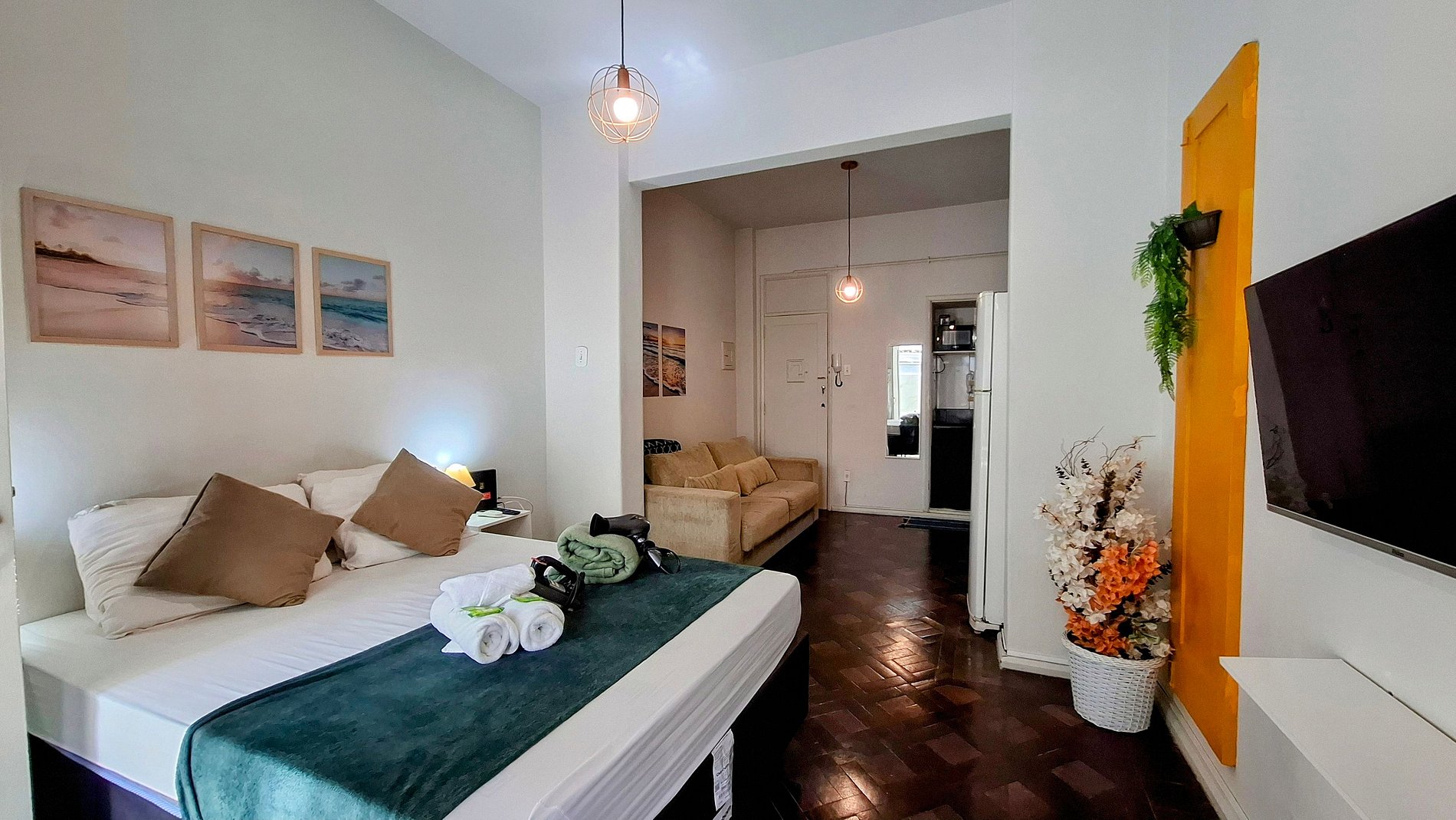 Y la conveniencia? Ah, es total! Hospitales, varias opciones de transporte (autobús, metro, parada de taxis, bicicletas del Itaú), comercios de todo tipo y servicios están a su alcance en el vibrante barrio de Copacabana.
