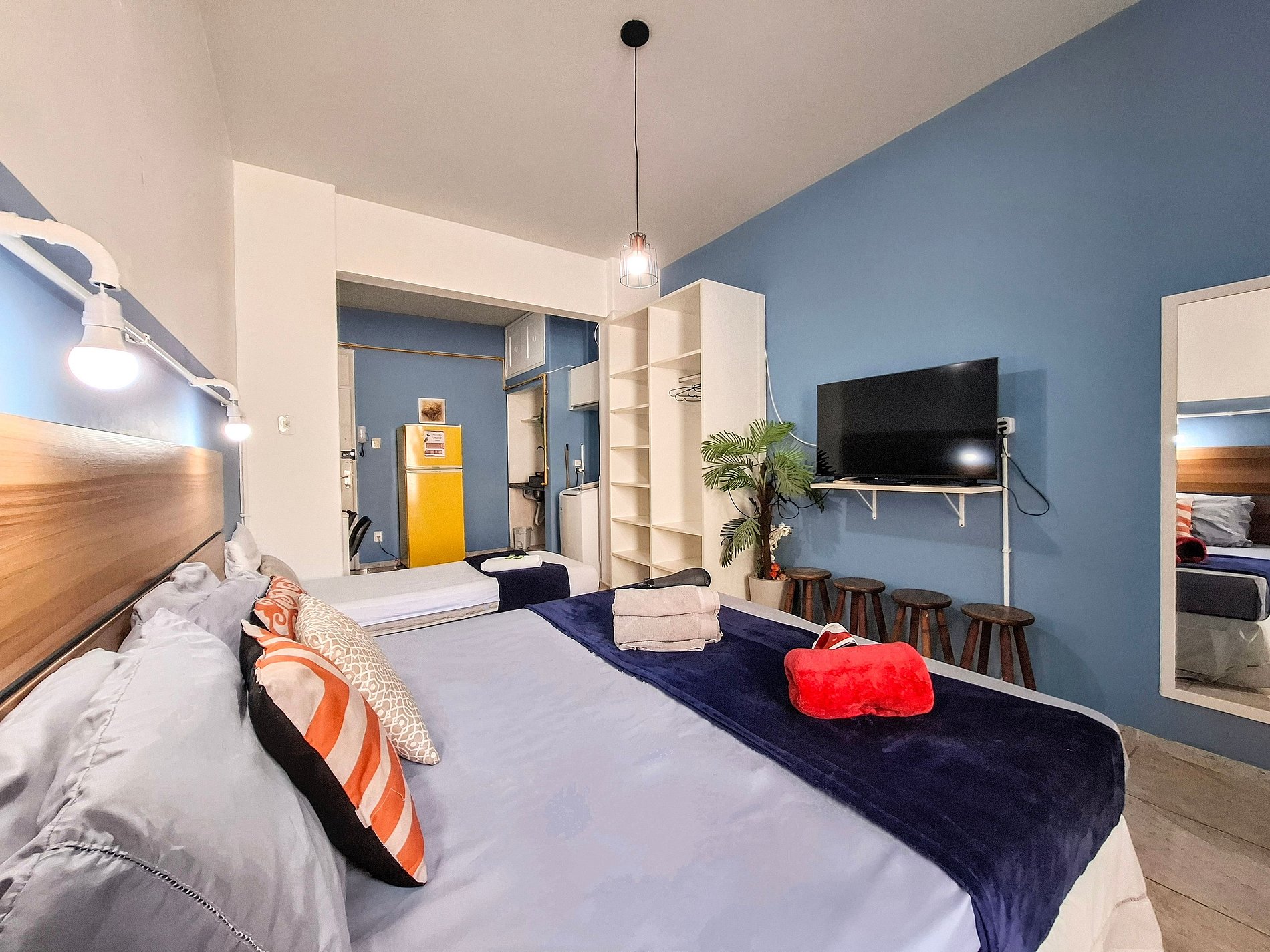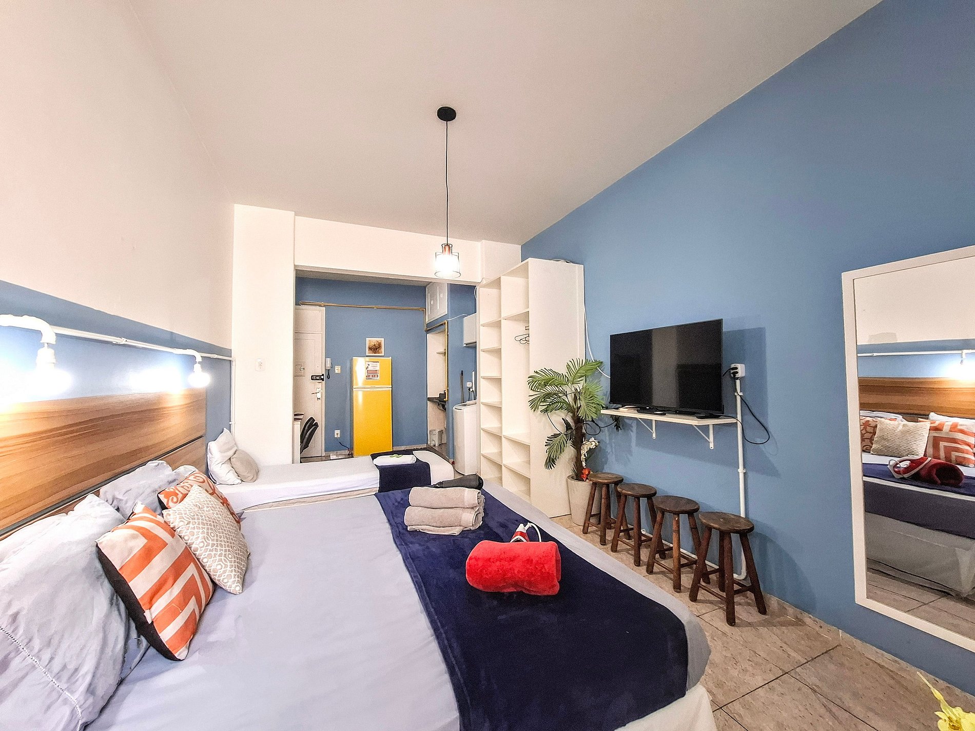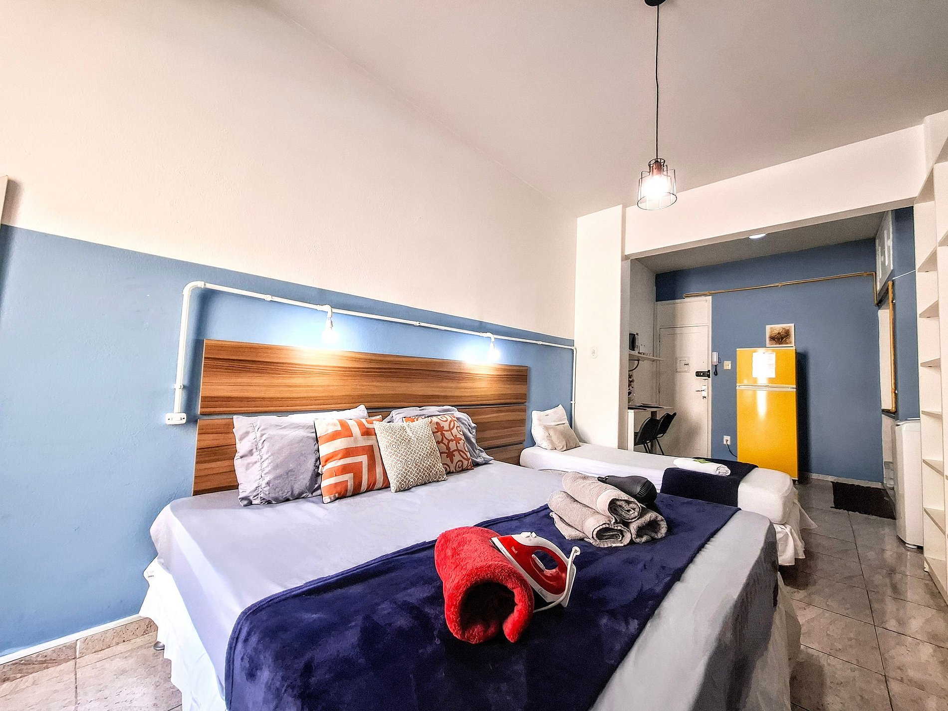 La practicidad de la cerradura electrónica te da total libertad para entrar y salir cuando quieras. Disfrute de una cómoda cama doble y una cama individual. Ropa de cama y baño olorosa y de calidad están incluidos. Para organizar sus cosas, un armario funcional le espera. El aire acondicionado garantiza frescura en los días soleados. El televisor está listo para tus momentos de relax, y la cortina blackout te invita a un sueño reparador. Plancha y secador de pelo son sus aliados para mantenerse siempre impecable. En la cocina completa, usted encuentra todo para preparar sus comidas con practicidad. El baño cuenta con ducha higiénica y agua caliente a gas para un baño relajante.