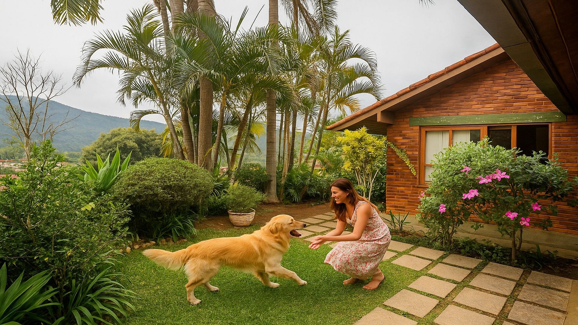 Al costado de la casa, un encantador patio se abre como una pequeña plaza privada. Un jardín con flores coloridas, sombrilla y sillas cómodas crean el ambiente perfecto para desayunos al aire libre, una copa de vino al atardecer o simplemente escuchar los pájaros. La vegetación exuberante y el paisajismo cuidado enmarcan un entorno de calma y bienestar.