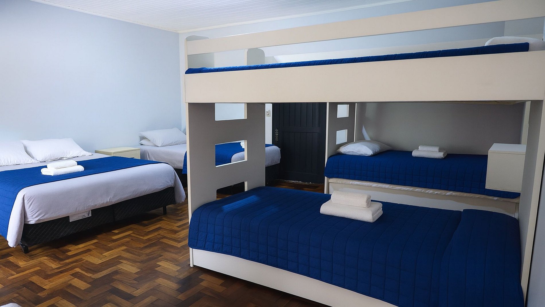 Nuestra habitación tiene capacidad para hasta 7 huéspedes, con 1 cama queen, 2 literas y 1 cama individual, ideal para familias o pequeños grupos. El alojamiento es funcional y cómodo, con baño compartido externo, siempre aseado, calefacción y ropa de cama y toallas siempre limpias y con buen olor.