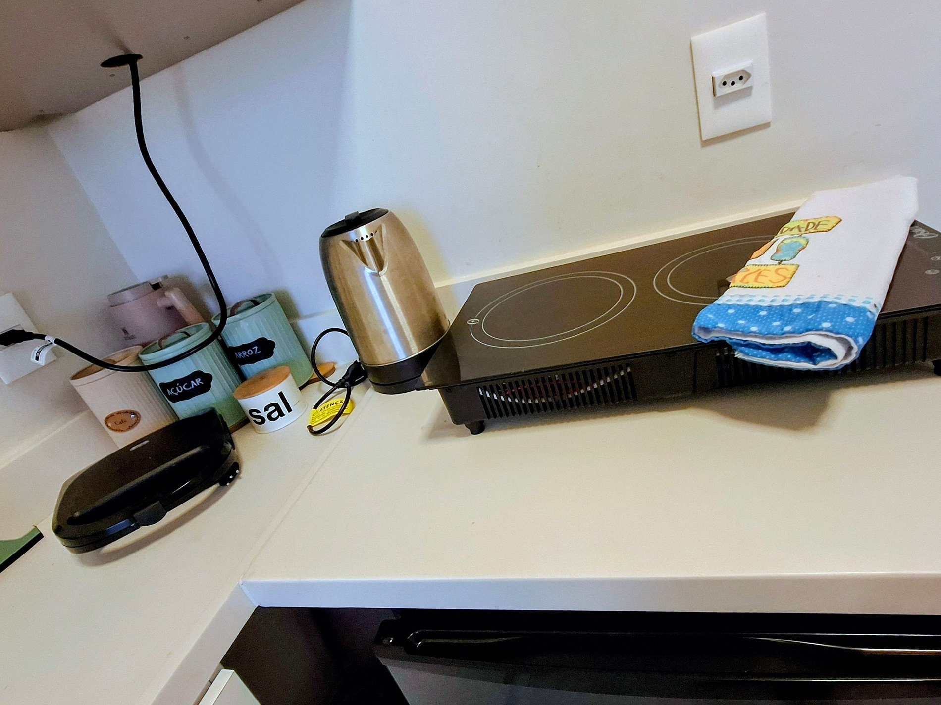 La cocina compacta es ideal para comidas rápidas: frigobar, hornilla, microondas, cafetera y utensilios básicos están a tu disposición.