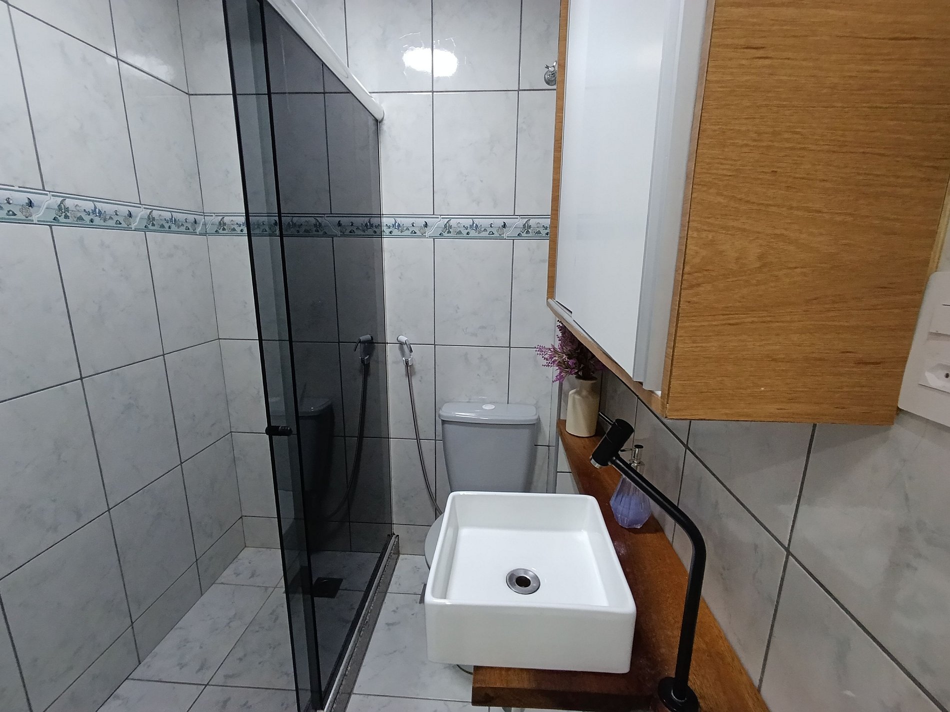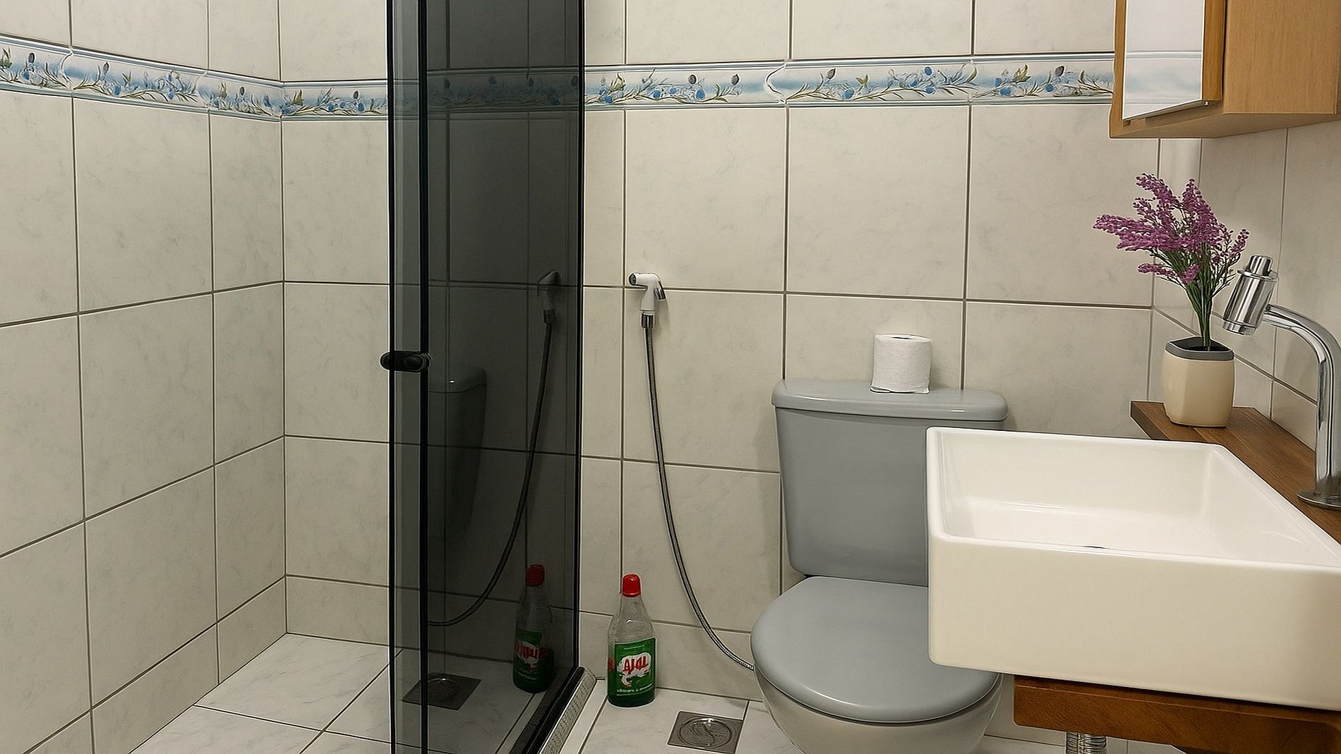 O banheiro é completo, com chuveiro quente, ventilação natural e toalhas disponíveis. Simples, limpo e funcional, como deve ser.