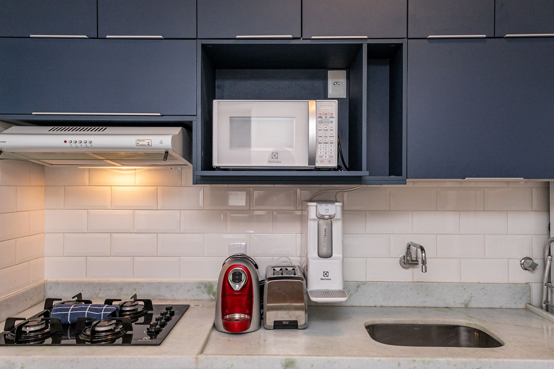 Cozinha totalmente equipada com fogão, forno, geladeira, congelador, máquina lava e seca, micro-ondas, liquidificador e torradeira. Conta também com louças, talheres, utensílios e garrafa de água. O condomínio possui recepção 24 horas e elevador para facilitar o acesso.