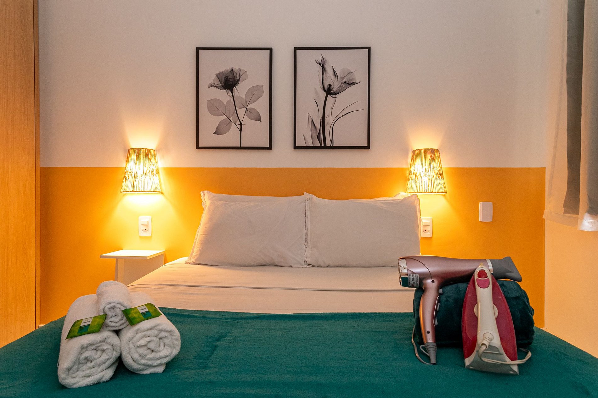 Fechadura eletrônica, Cama Queen, Colchão de solteiro, roupas de cama e banho, Closet, ar-condicionado, TV, ventilador, cortina com blackout, ferro de passar, secador de cabelo, guarda-roupa, cabides, sofá, cozinha completa, Ducha higiênica, Água quente a gás.