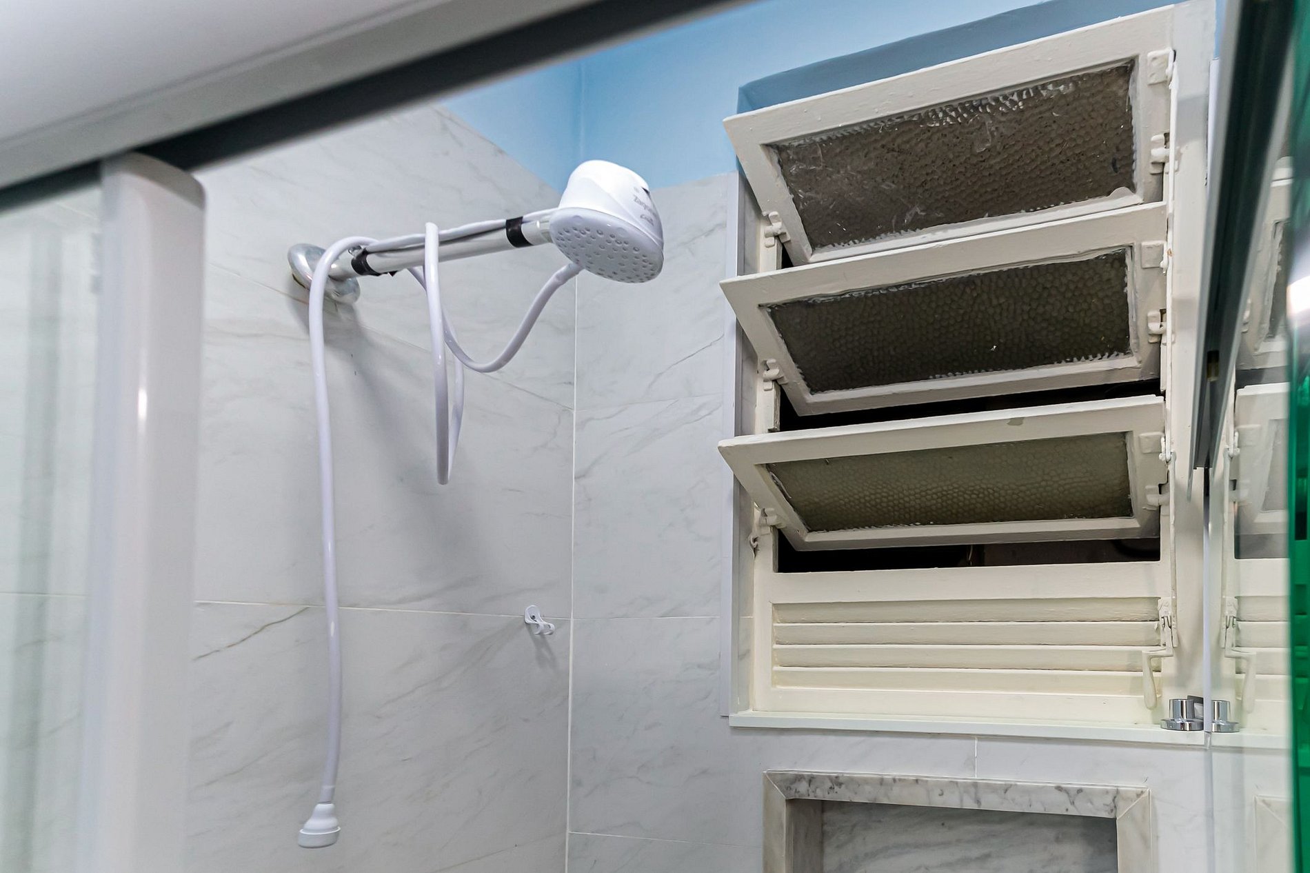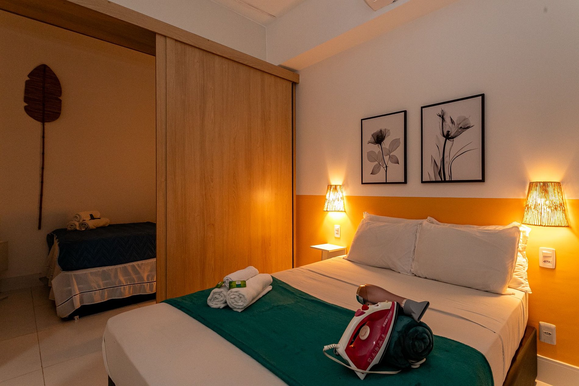Fechadura eletrônica, Cama Queen, Colchão de solteiro, roupas de cama e banho, Closet, ar-condicionado, TV, ventilador, cortina com blackout, ferro de passar, secador de cabelo, guarda-roupa, cabides, sofá, cozinha completa, Ducha higiênica, Água quente a gás.