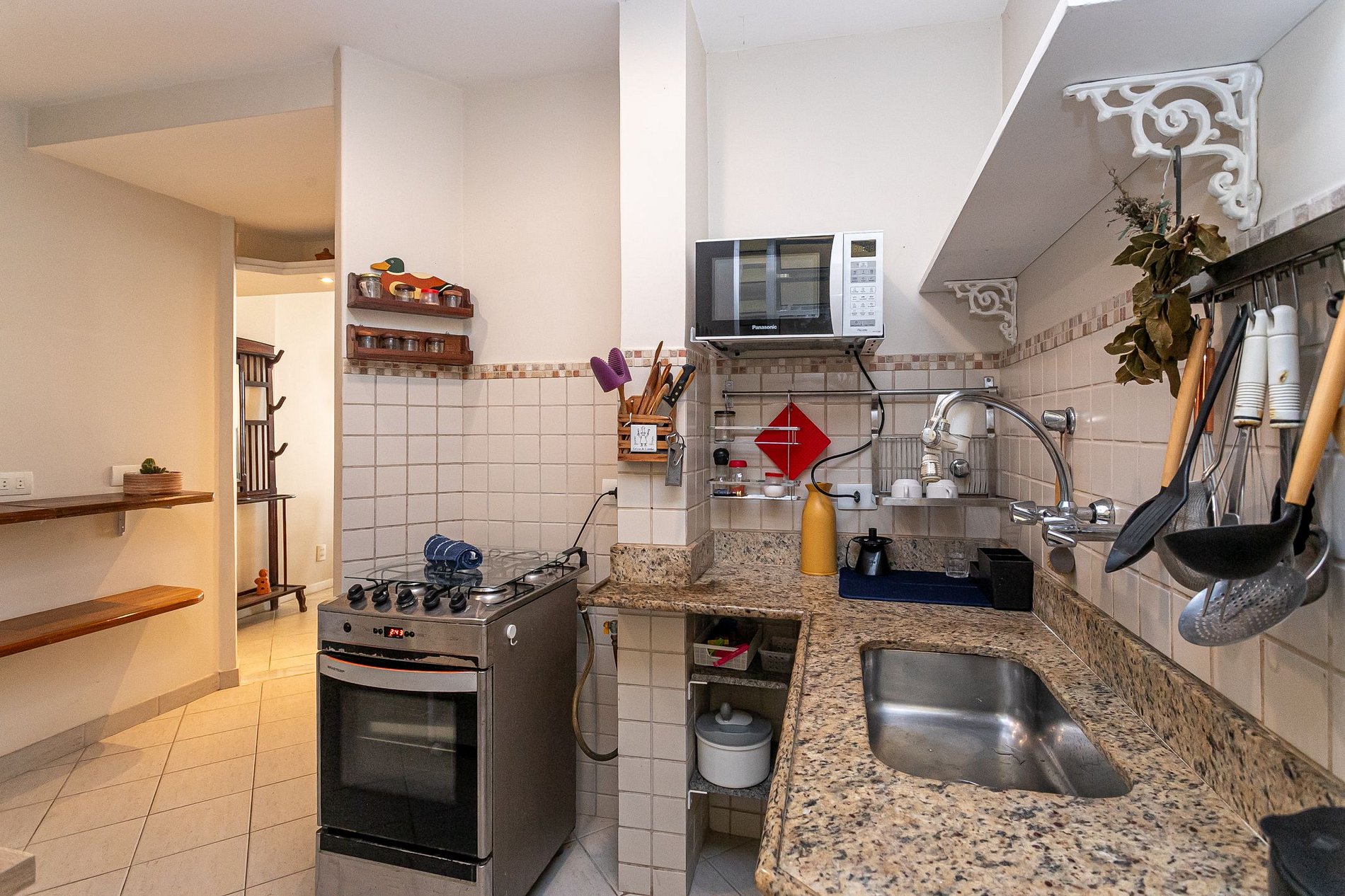 A cozinha está equipada com fogão, forno, geladeira, congelador, micro-ondas, liquidificador, torradeira, além de louças, talheres, utensílios e garrafa de água reutilizável. Um ambiente funcional e prático para você preparar suas refeições sempre que desejar.