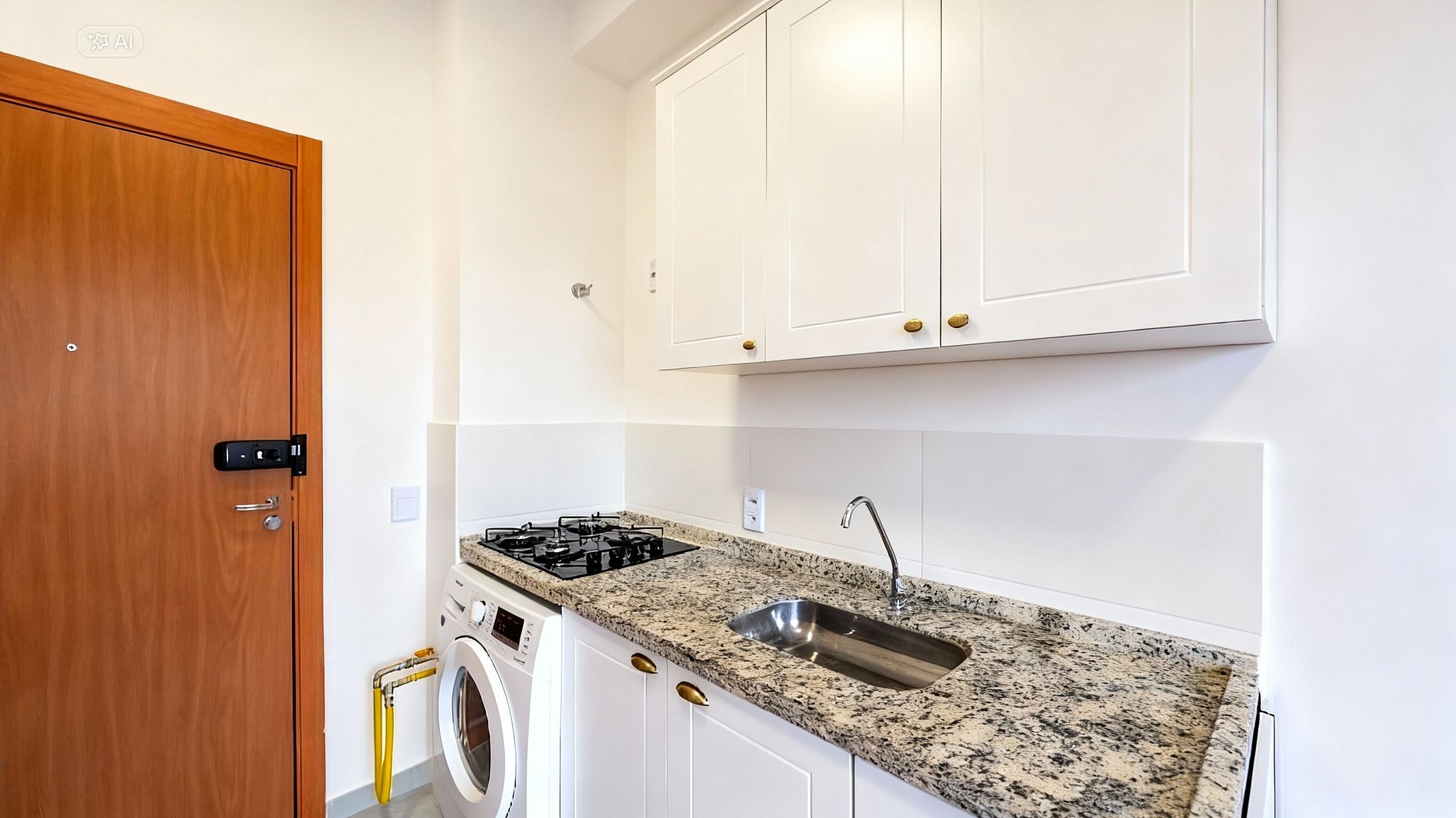 A cozinha está equipada com cooktop, geladeira, micro-ondas, liquidificador, torradeira, panela de arroz e cafeteira, além de louças, talheres e utensílios em geral.