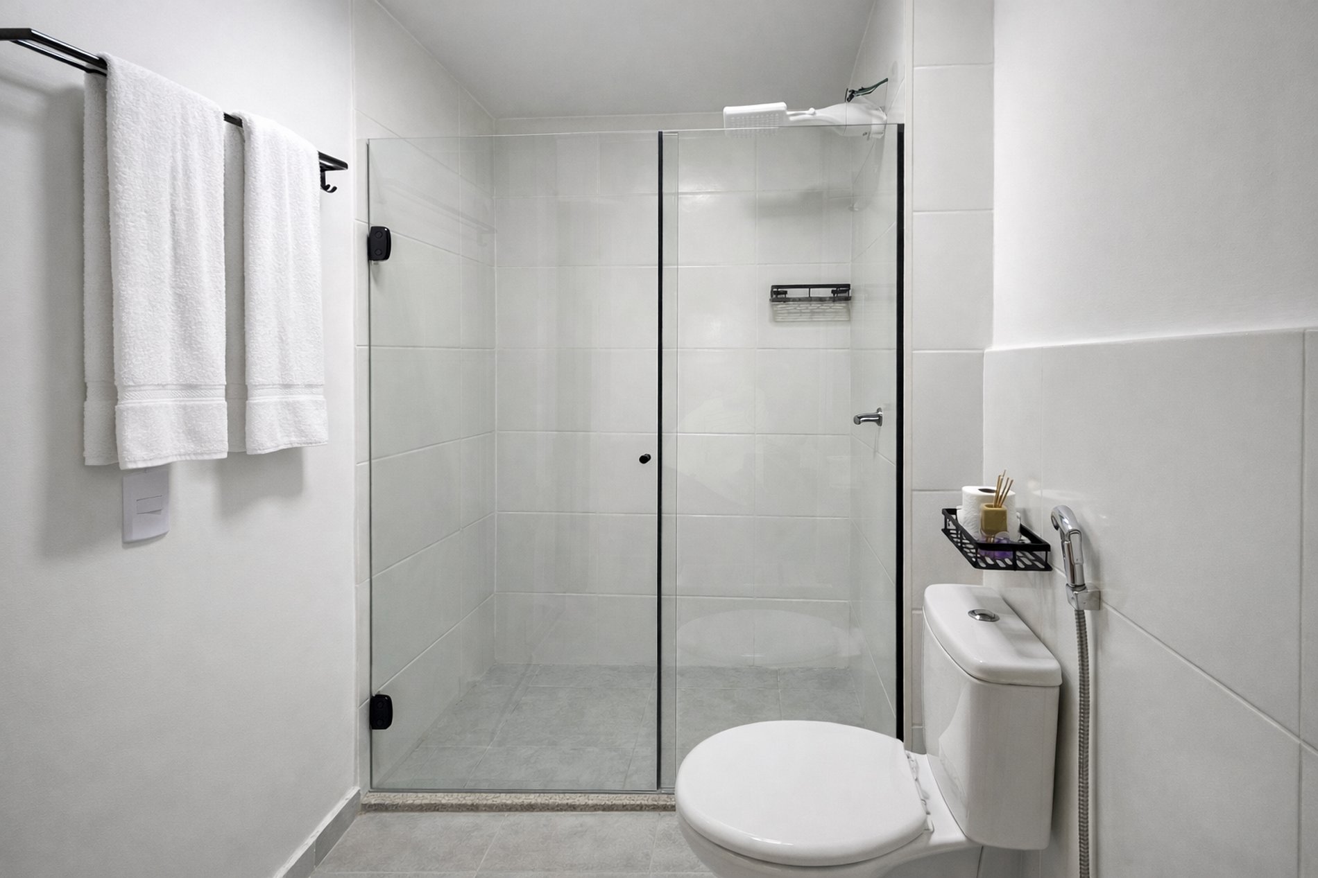 O banheiro social é completo, equipado com chuveiro acessível sem degraus, itens essenciais de higiene como sabonete, toalha e papel higiênico, além de água quente disponível a qualquer momento.