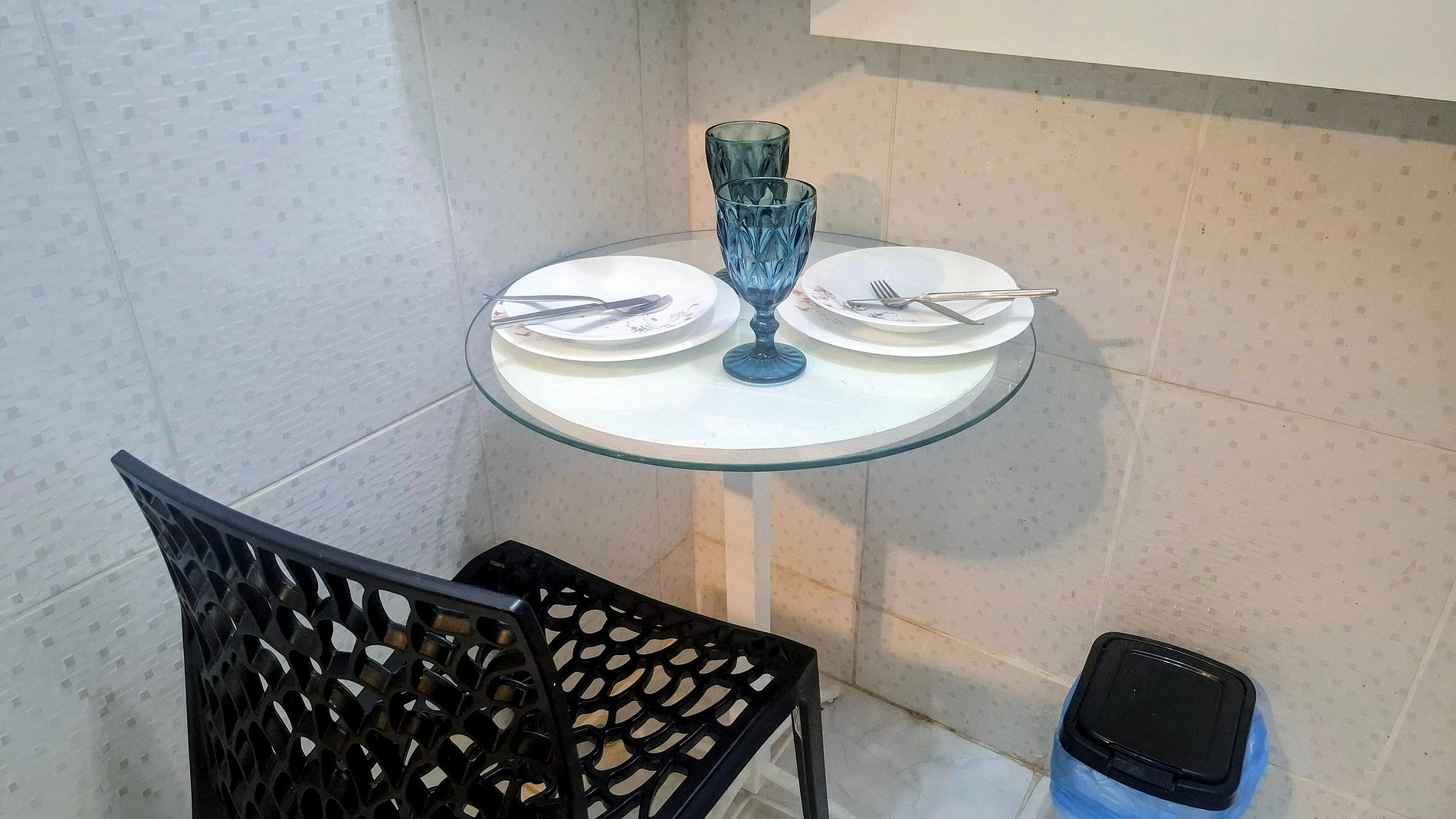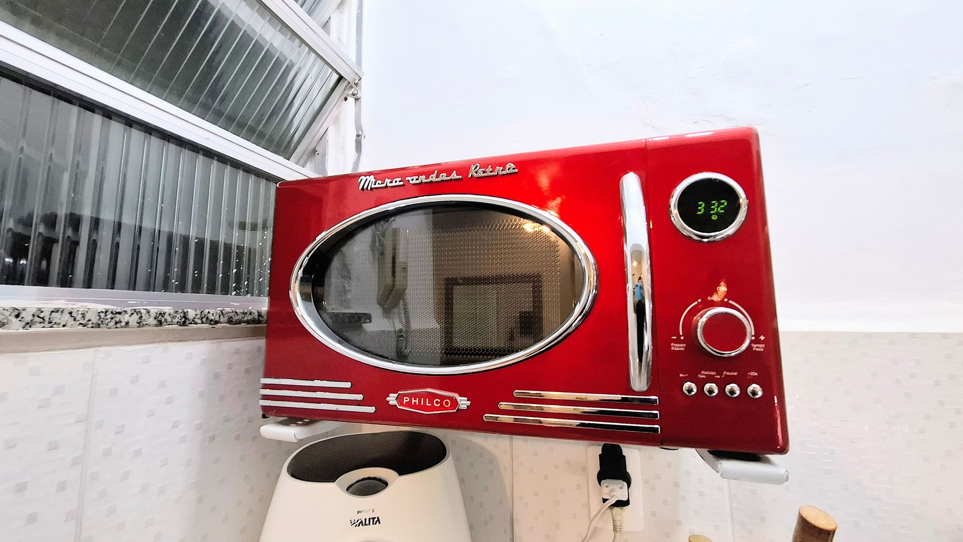 A cozinha é totalmente equipada com cooktop, geladeira com congelador para armazenar alimentos, air fryer e microondas, para economizar seu tempo e esforço. Louça, talheres e utensílios completos permitem fazer refeições quando desejar. Uma garrafa de água reutilizável mantém você hidratado de forma sustentável.