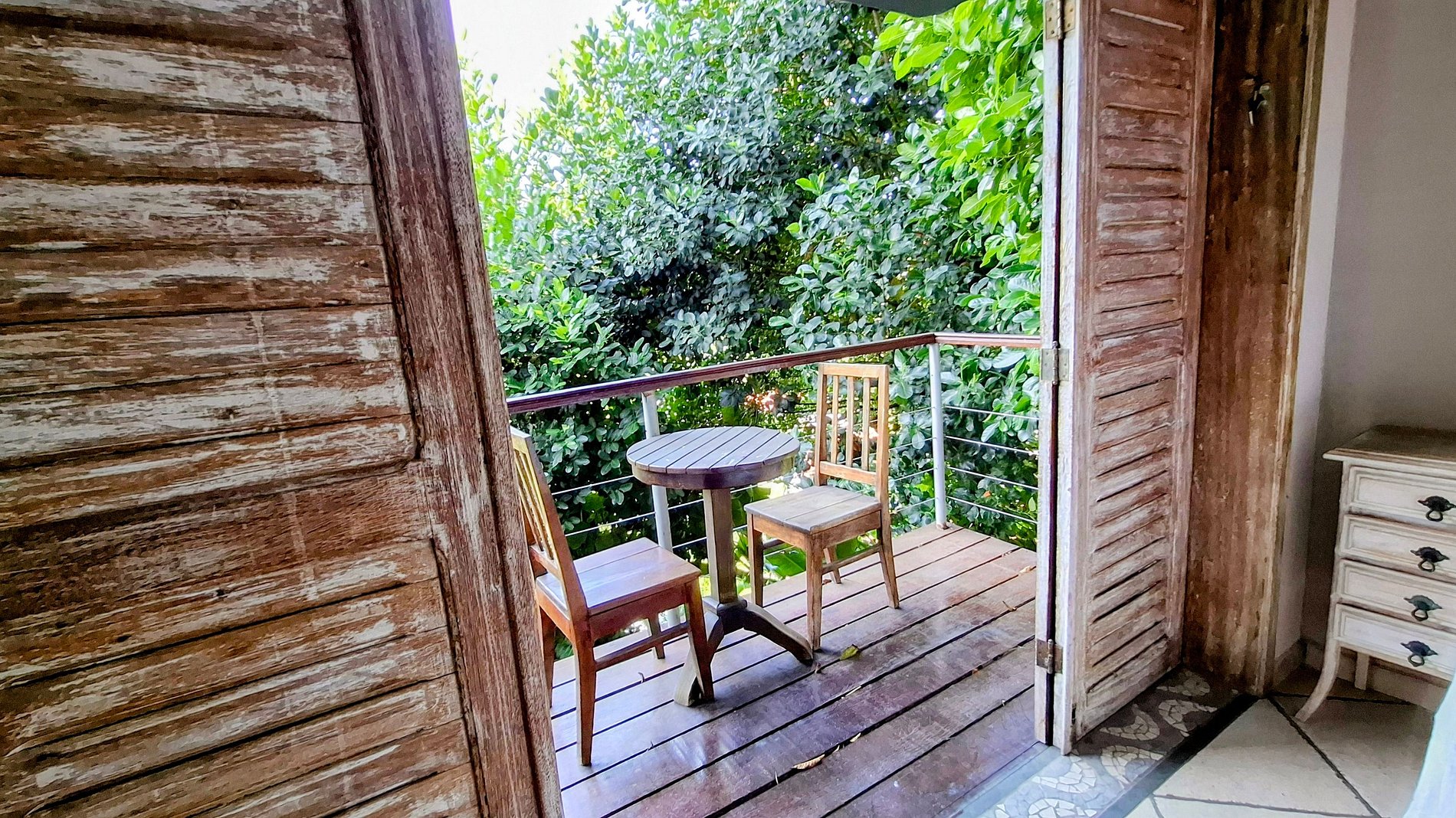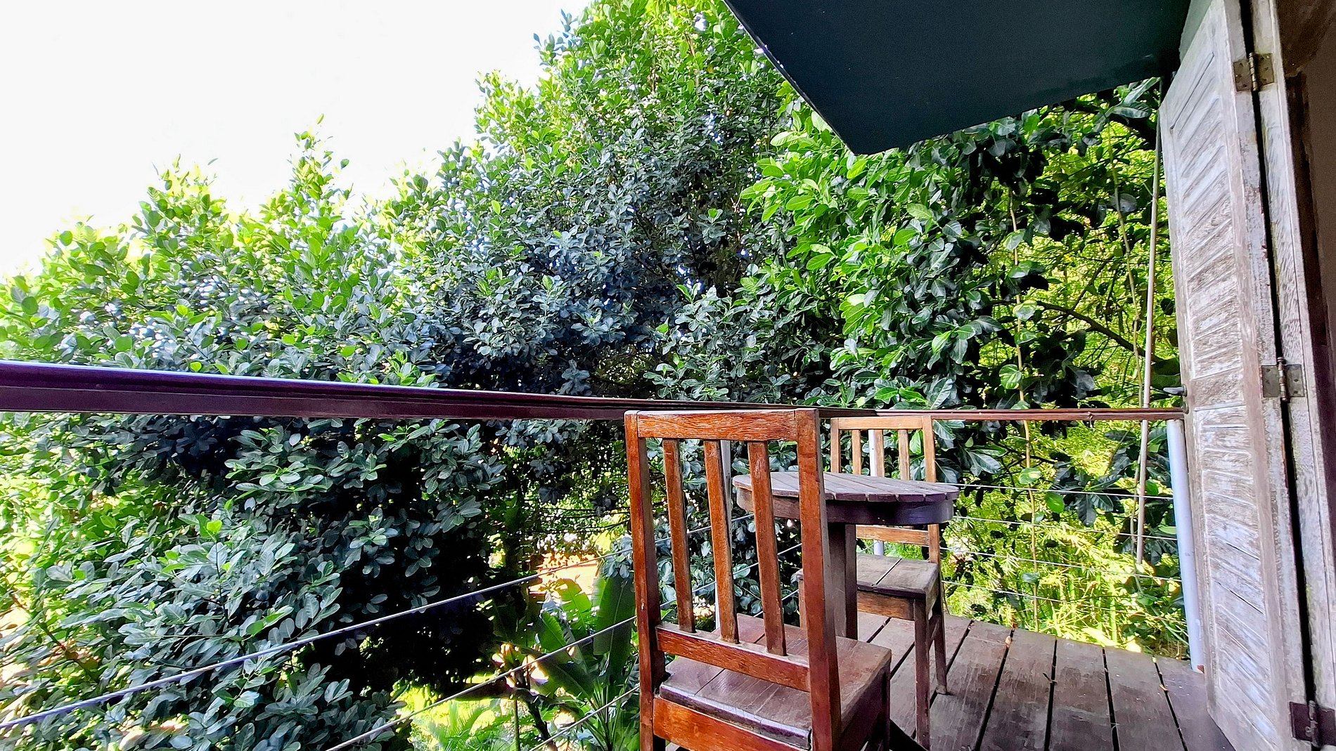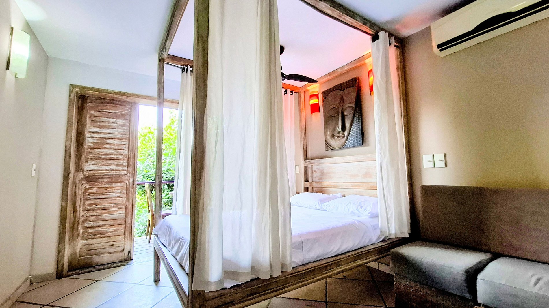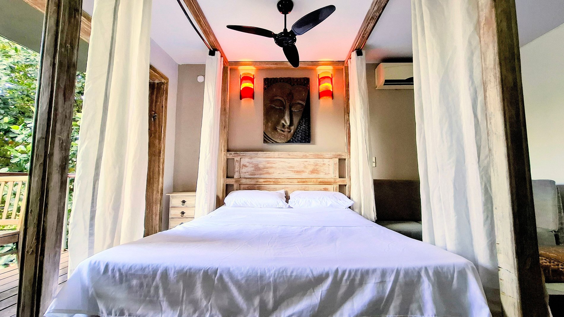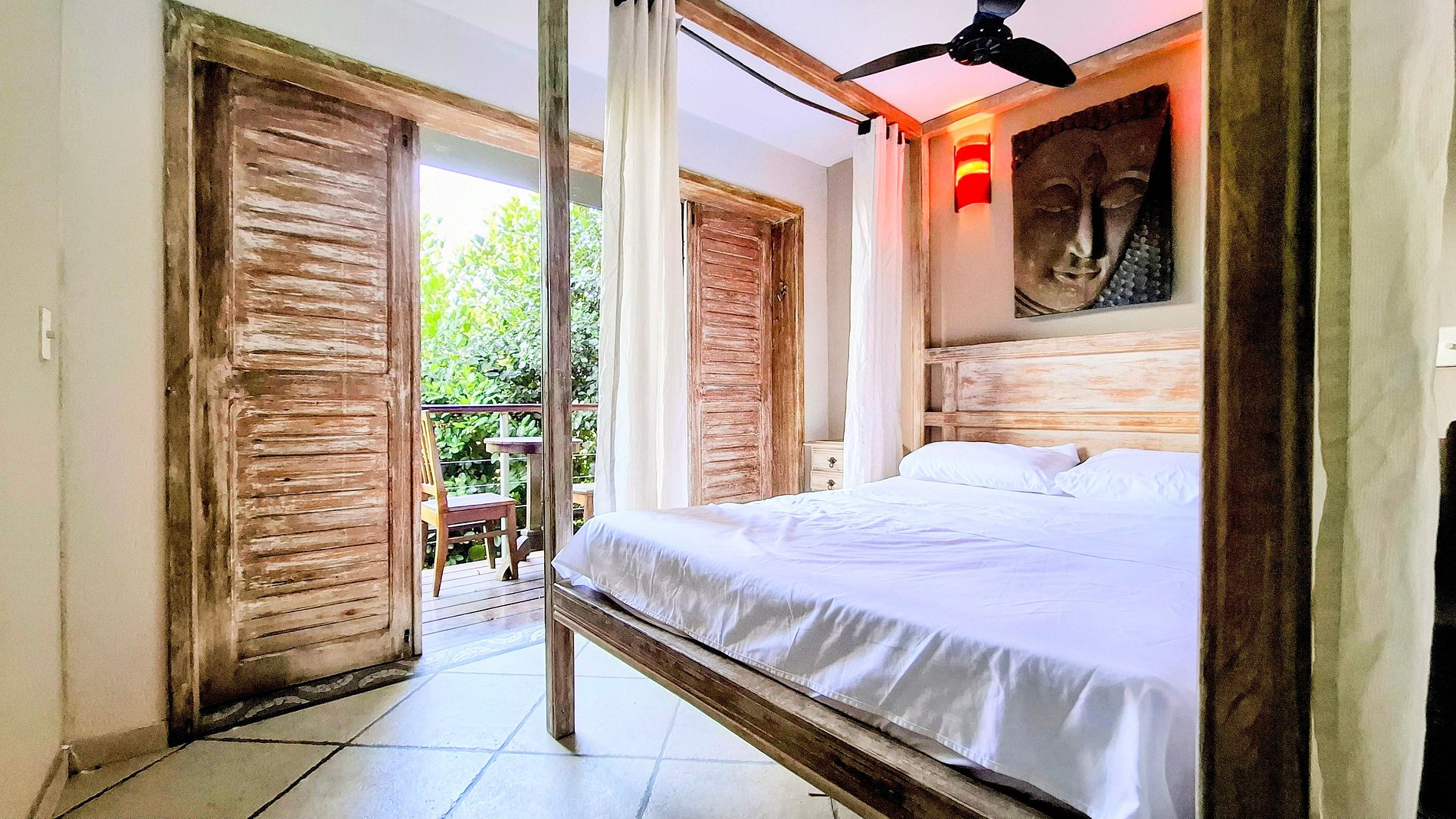 O acesso à varanda ampla é ideal para relaxar, ler ou apreciar o ambiente. Ventiladores de teto e portátil oferecem conforto em dias mais quentes. Cortinas blackout controlam a luz natural conforme sua preferência.