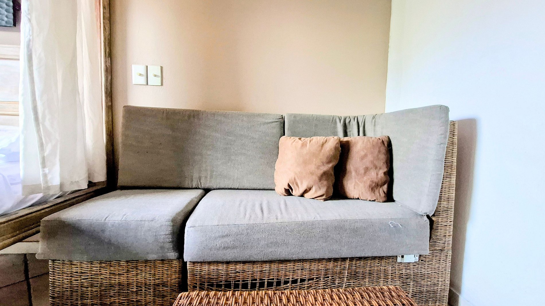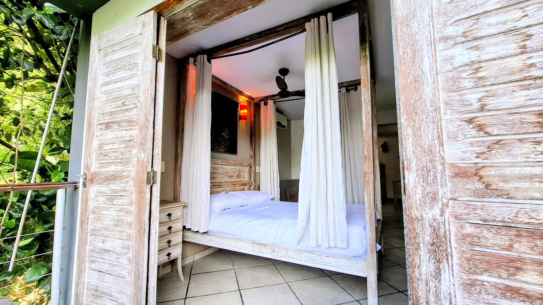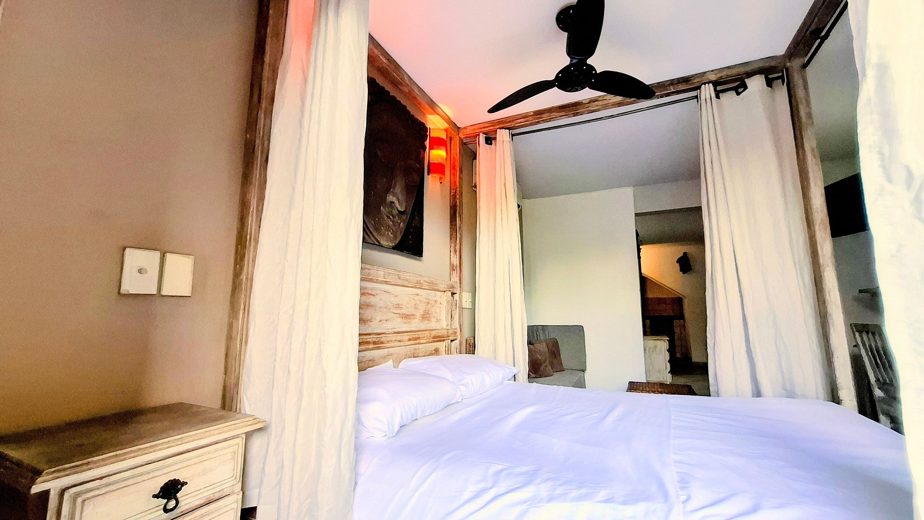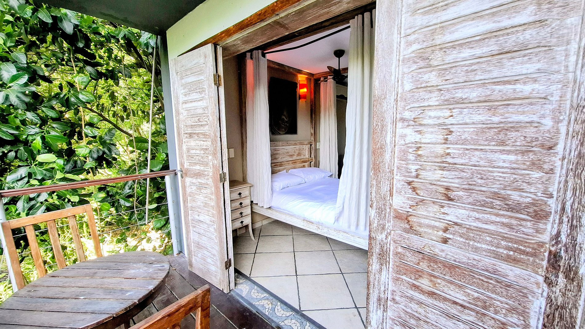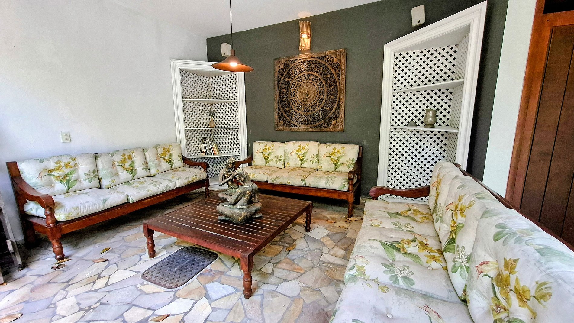O acesso à varanda ampla é ideal para relaxar, ler ou apreciar o ambiente. Ventiladores de teto e portátil oferecem conforto em dias mais quentes. Cortinas blackout controlam a luz natural conforme sua preferência.