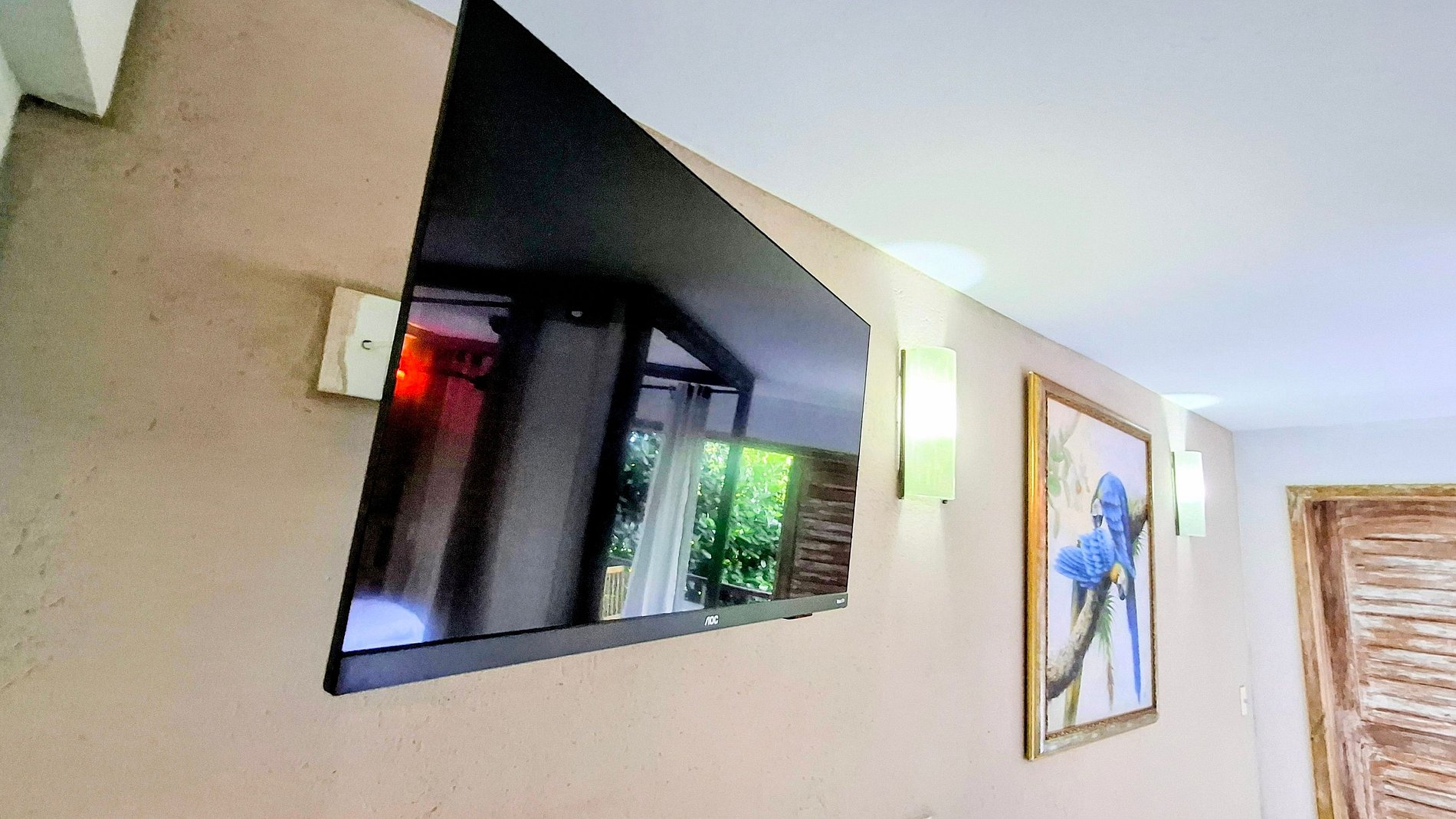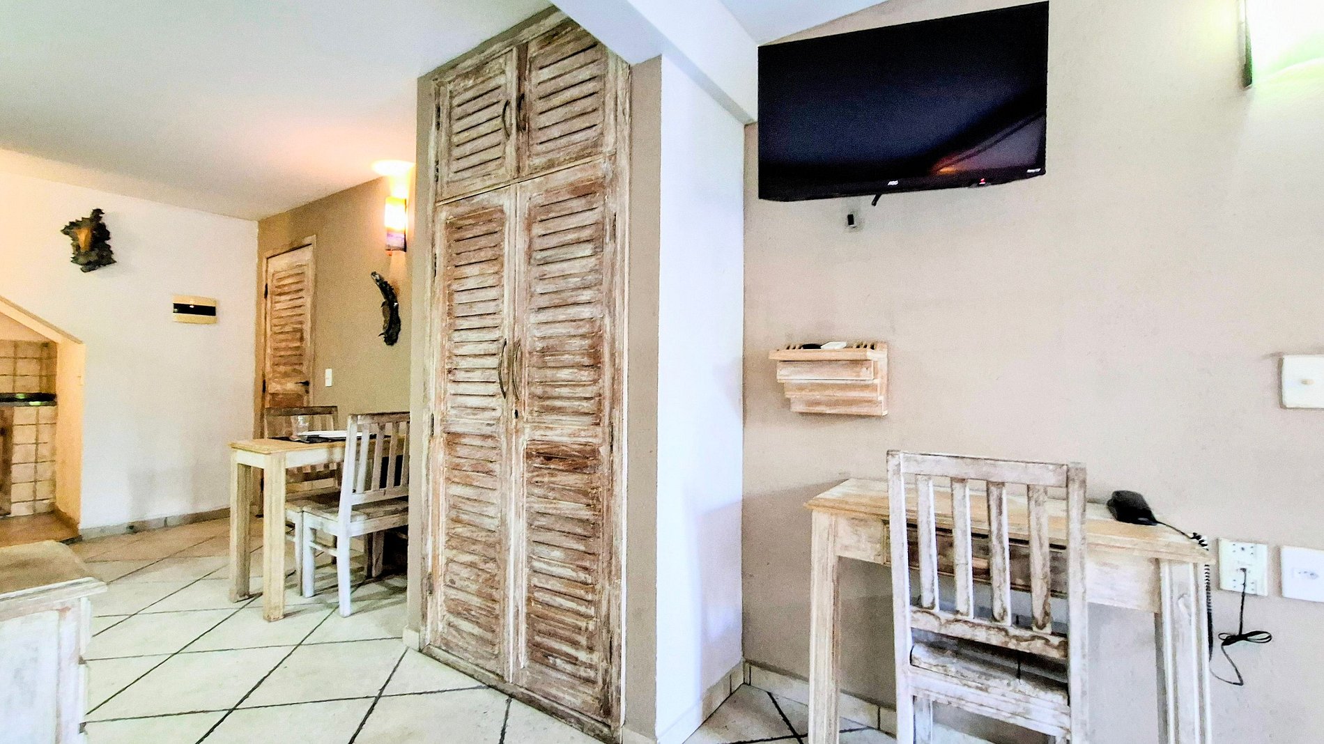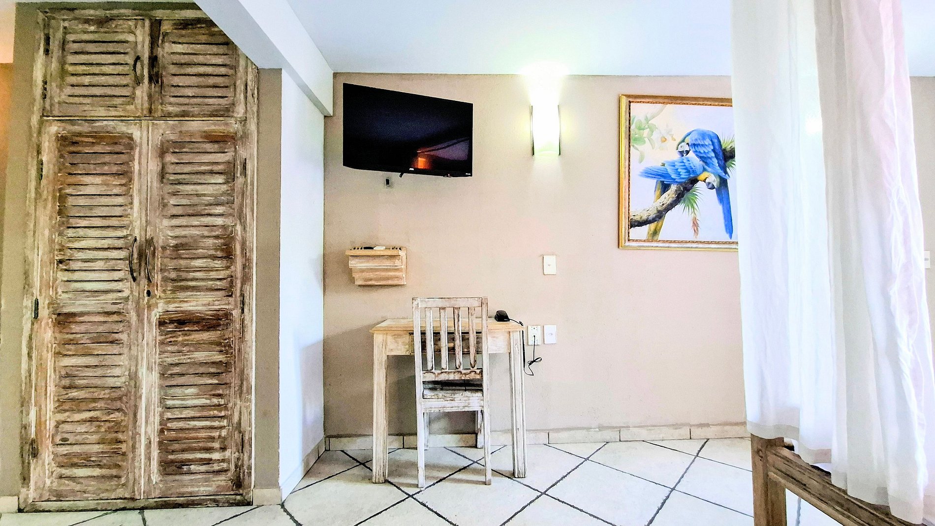 TV Smart com canais a cabo oferece entretenimento. O banheiro social é completo com chuveiro acessível sem degraus, itens básicos de higiene, tais como sabonete, toalha e papel higiênico, além de água quente em qualquer hora.