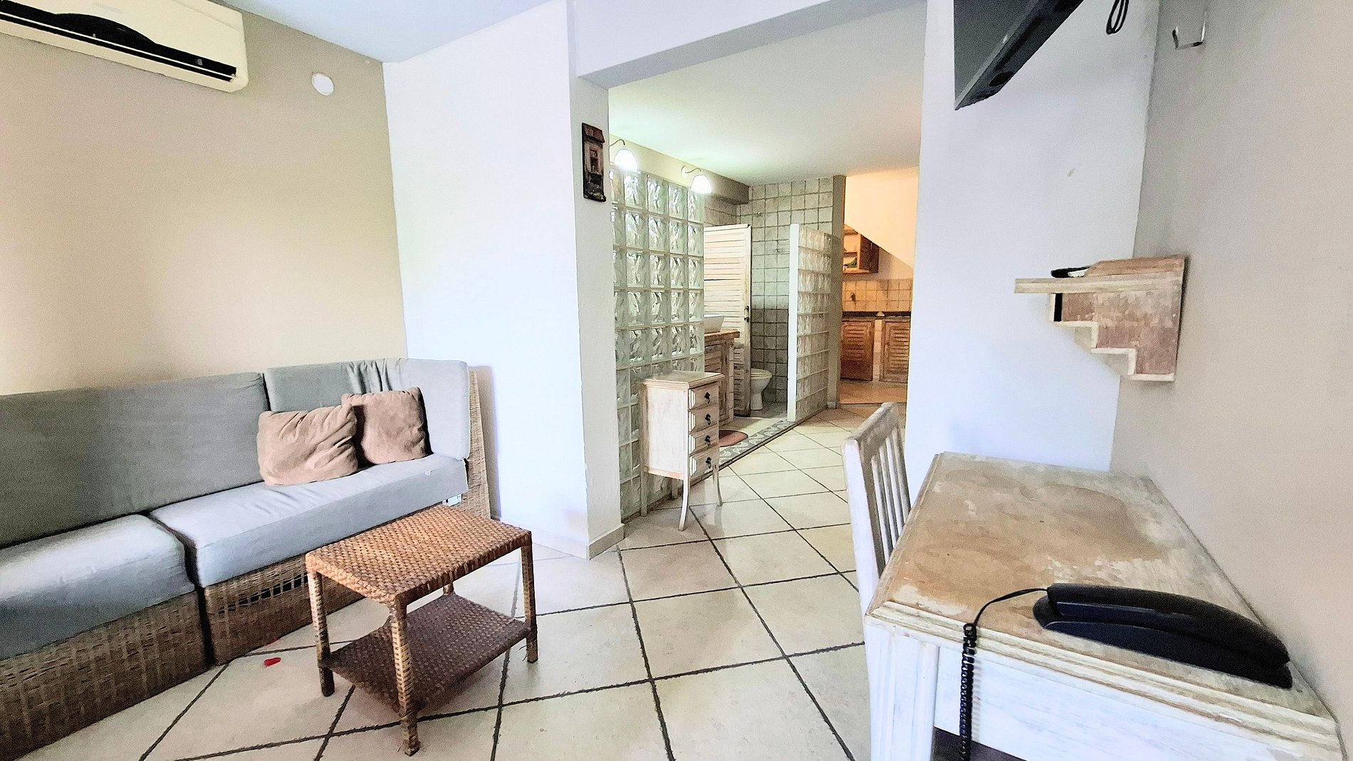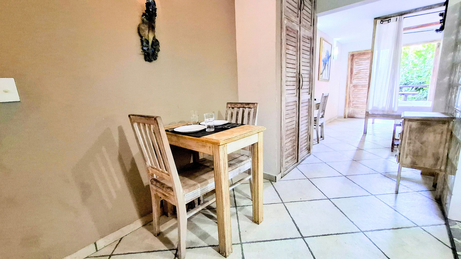 A sala de estar acomoda um sofá-cama confortável que recebe facilmente mais um hóspede, um colchão de solteiro adicional oferece flexibilidade. Uma mesa de jantar permite compartilhar momentos com familiares e amigos.
