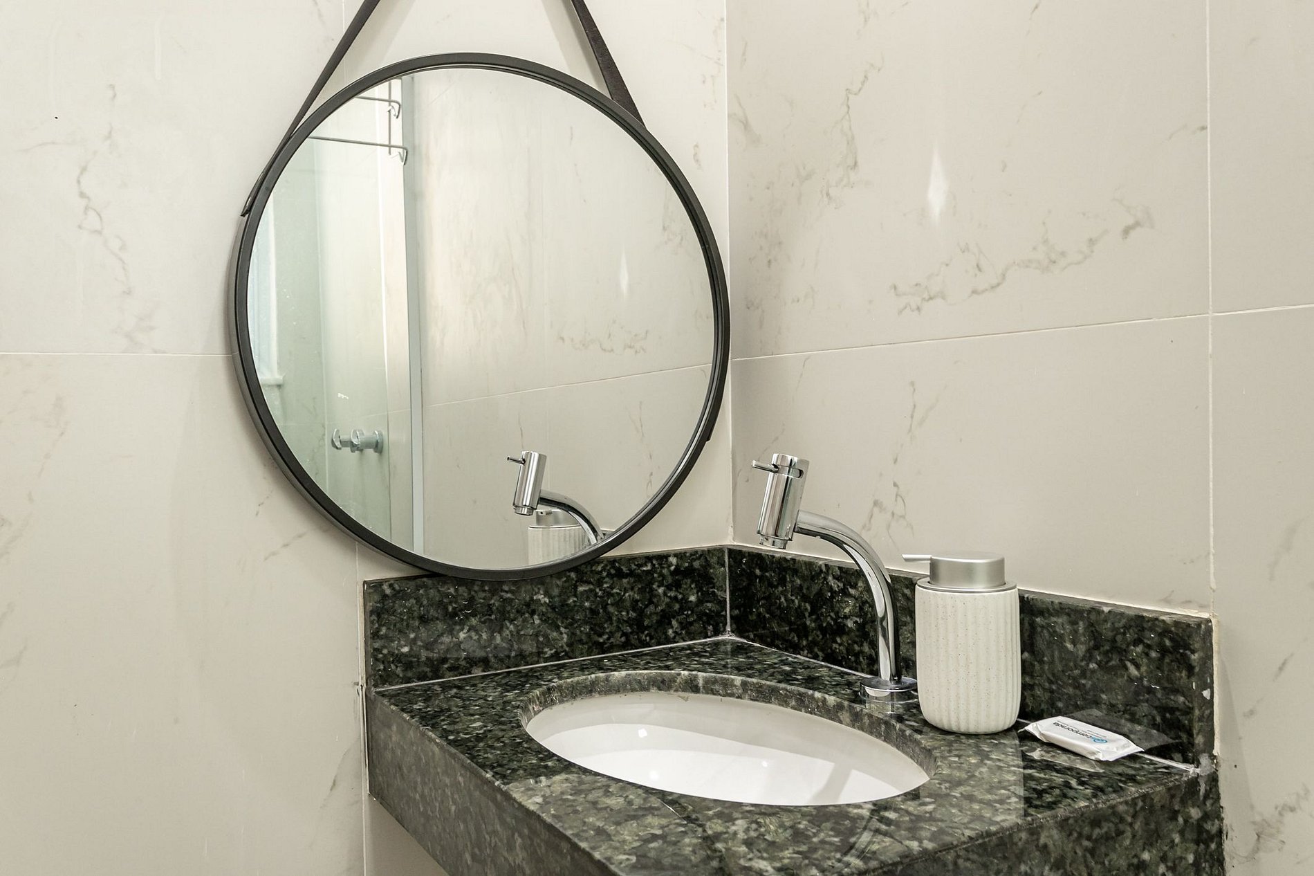 Banheiro social completo, equipado com chuveiro, espelho e itens de higiene. A limpeza segue o padrão Yes Temporada.