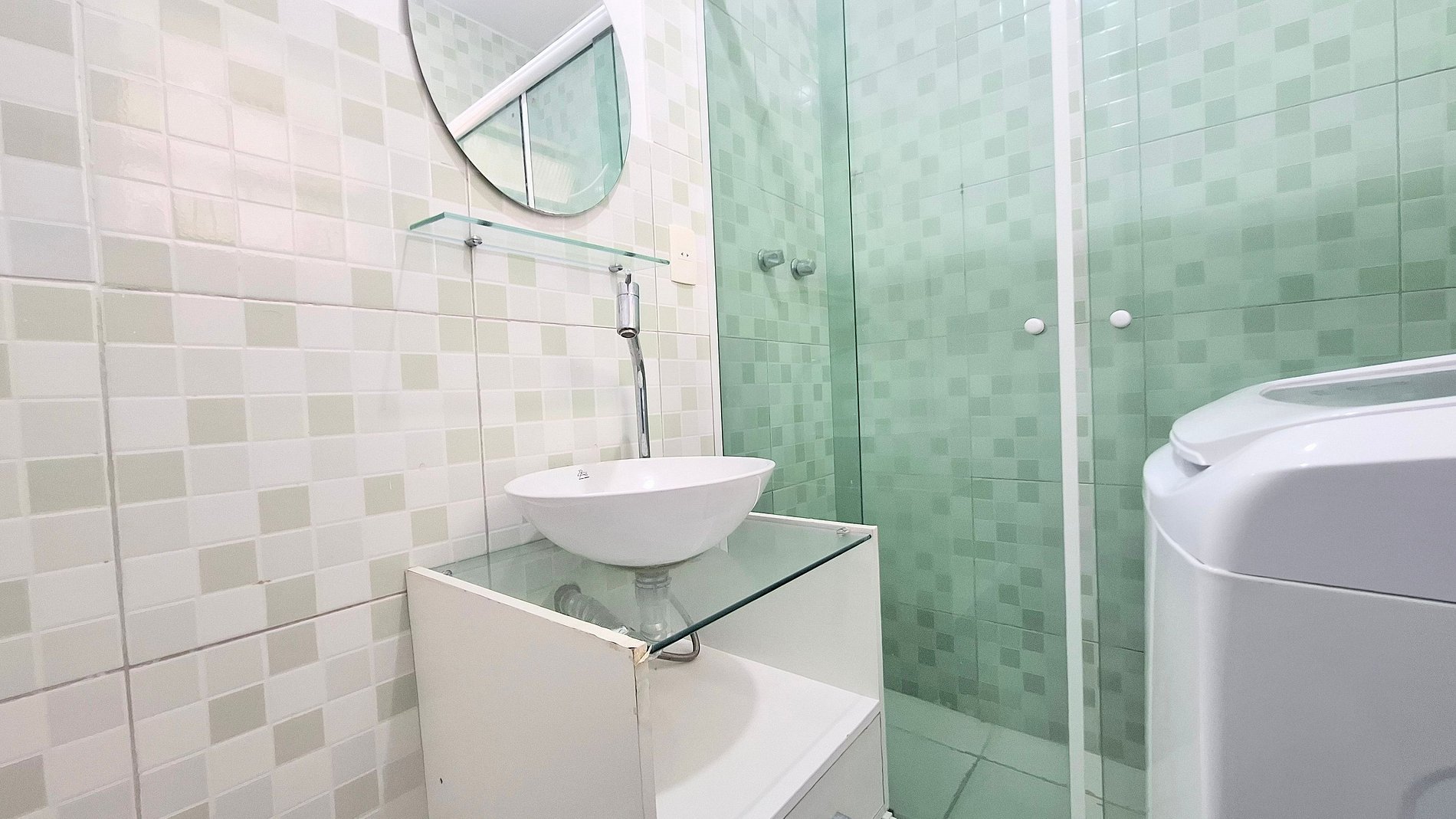 Banheiro social completo com chuveiro, espelho e itens de higiene. Higienização realizada conforme o padrão Yes Temporada.