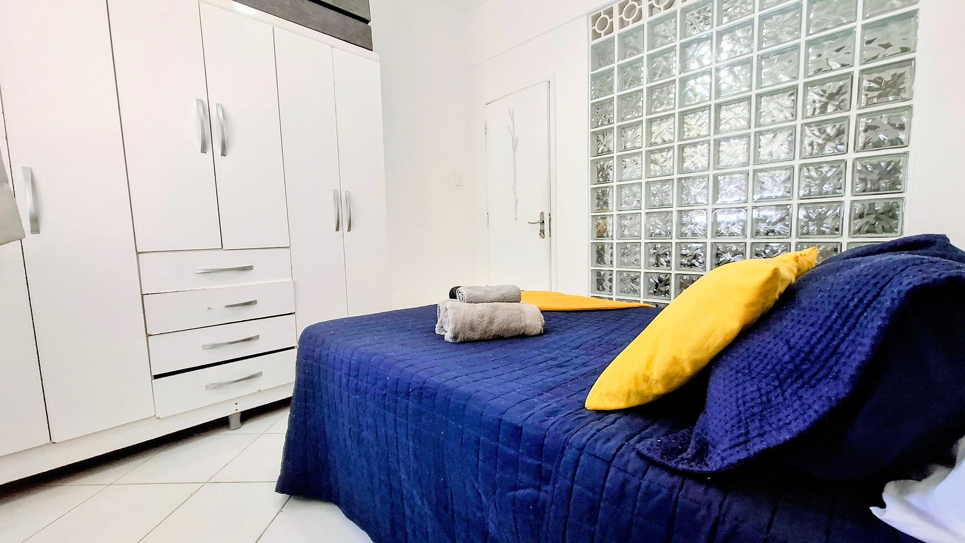 Configuração com 1 cama queen. Possui janelas para ventilação natural e armários para organização de bagagens.