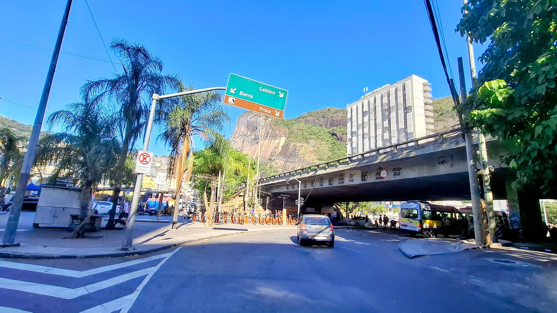 Táxis e carros de aplicativo operam com tempo de espera reduzido na porta do edifício. Linhas de ônibus circulam pelas principais vias de São Conrado, conectando o bairro a outras regiões da cidade.