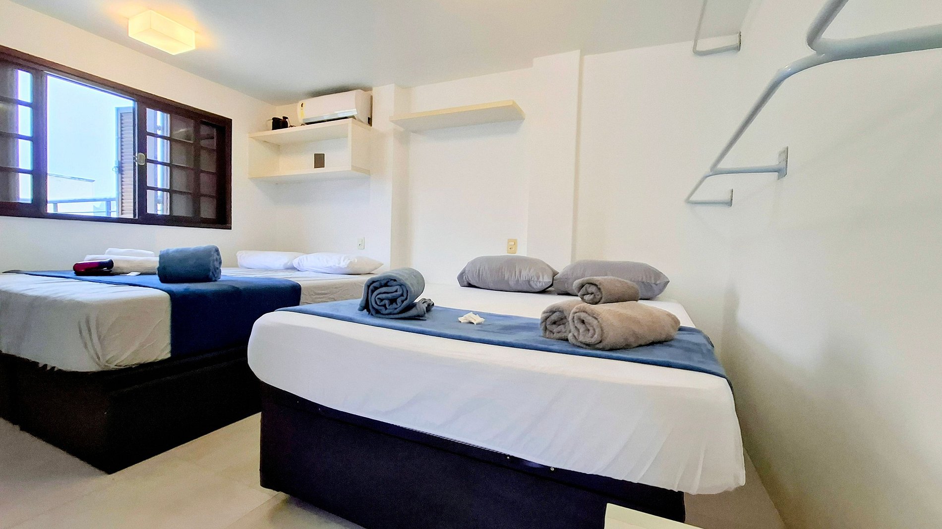 Configuração com 1 cama queen e 1 cama de casal . Possui janelas para ventilação natural, mobilias e arraras para organização de roupas e bagagens.