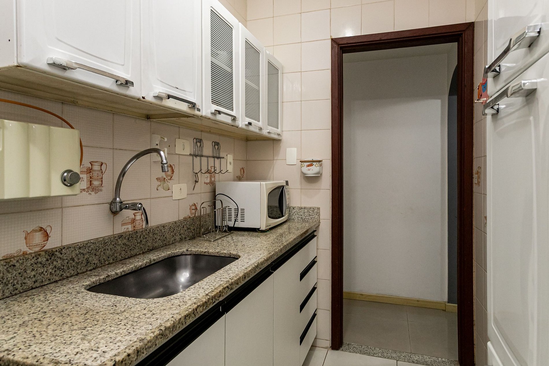 Cozinha totalmente equipada, com fogão, geladeira, micro-ondas, cafeteira e máquina de lavar.