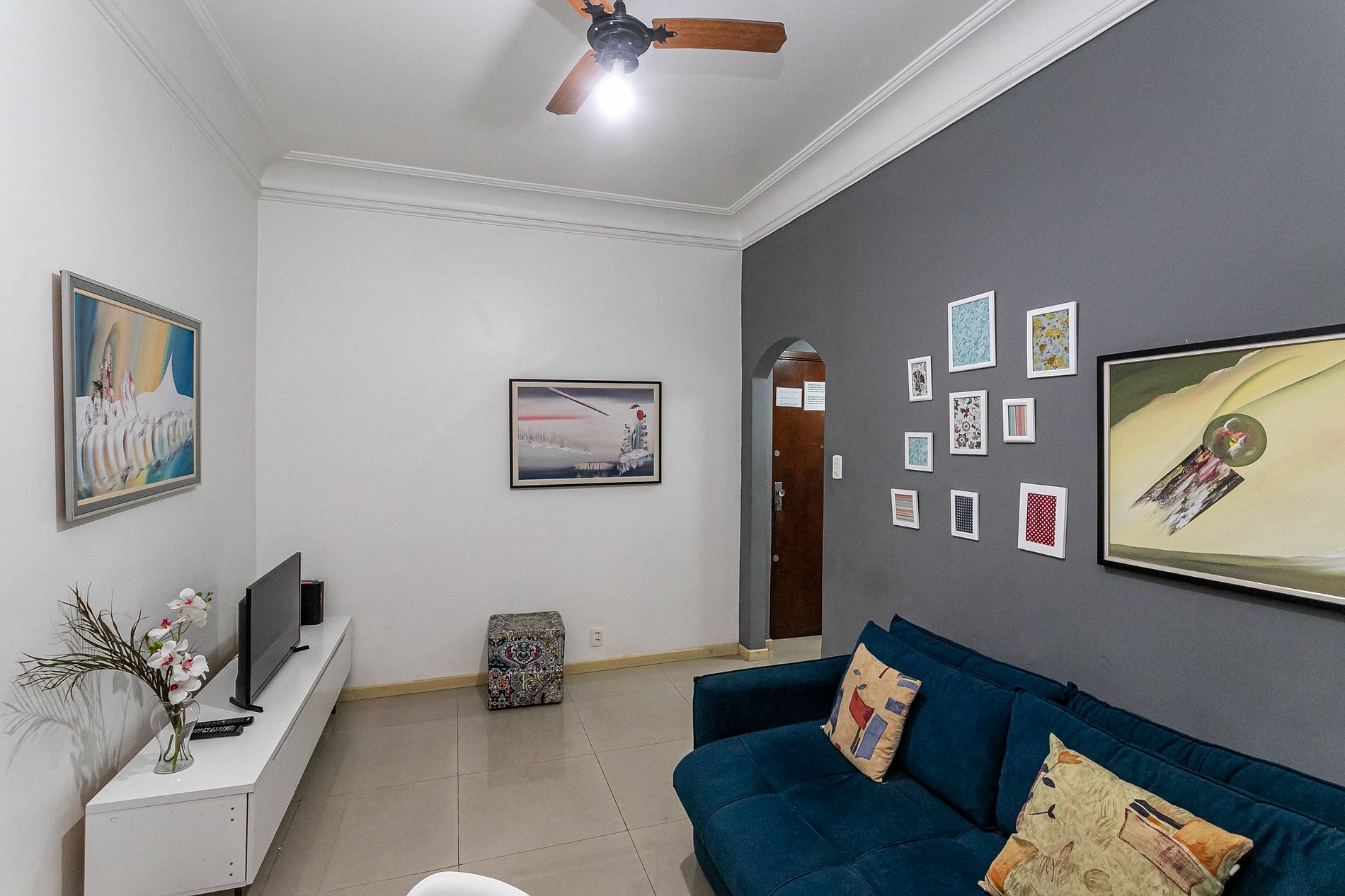 A sala de estar possui sofá em veludo azul-marinho, Smart TV, mesa de jantar redonda e climatização completa.