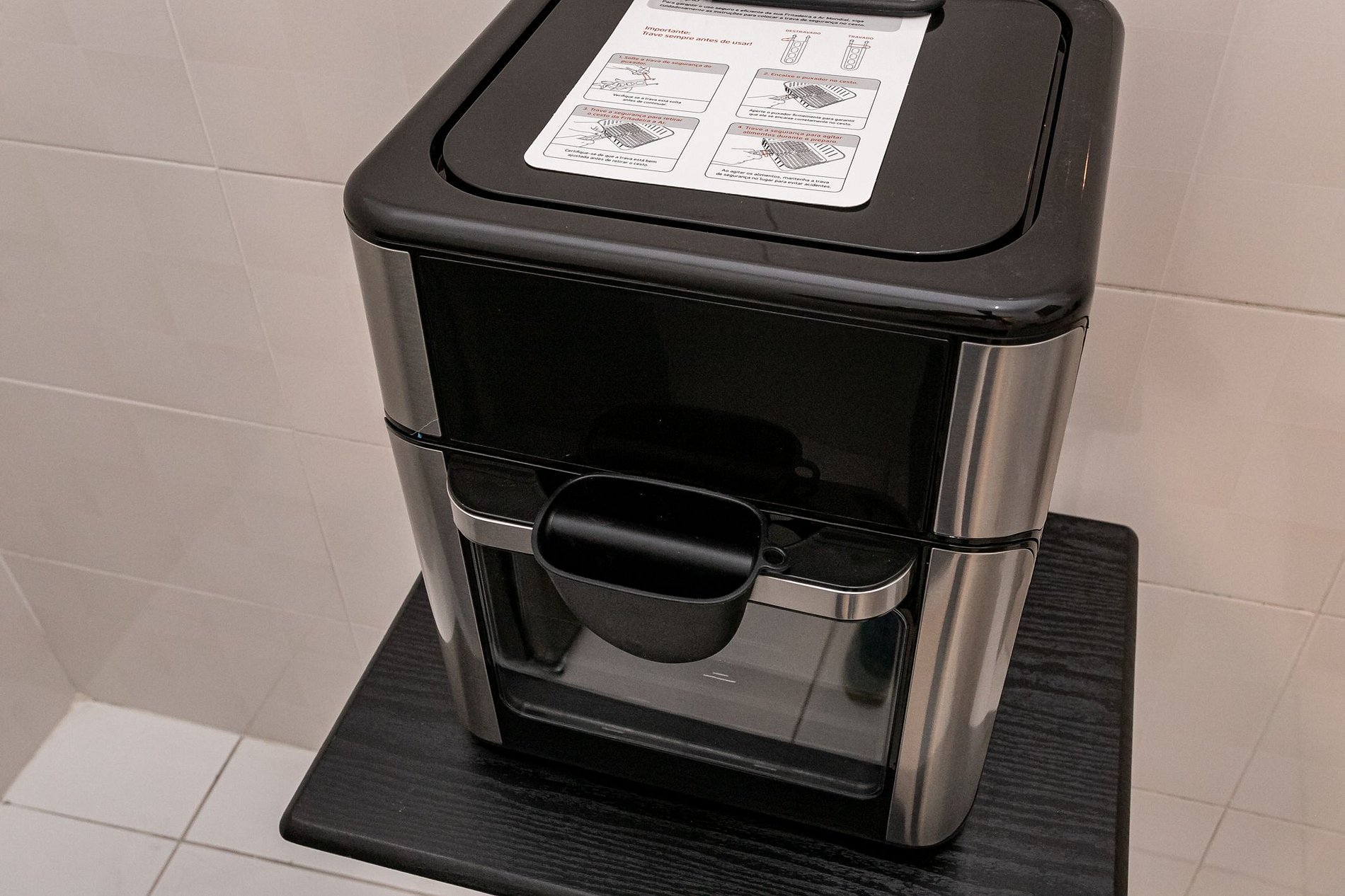 A cozinha é completa e equipada com bancada em granito, armários planejados, geladeira, micro-ondas, air fryer e cafeteira.