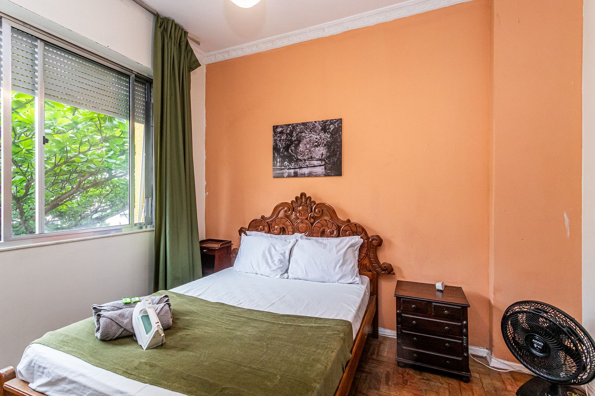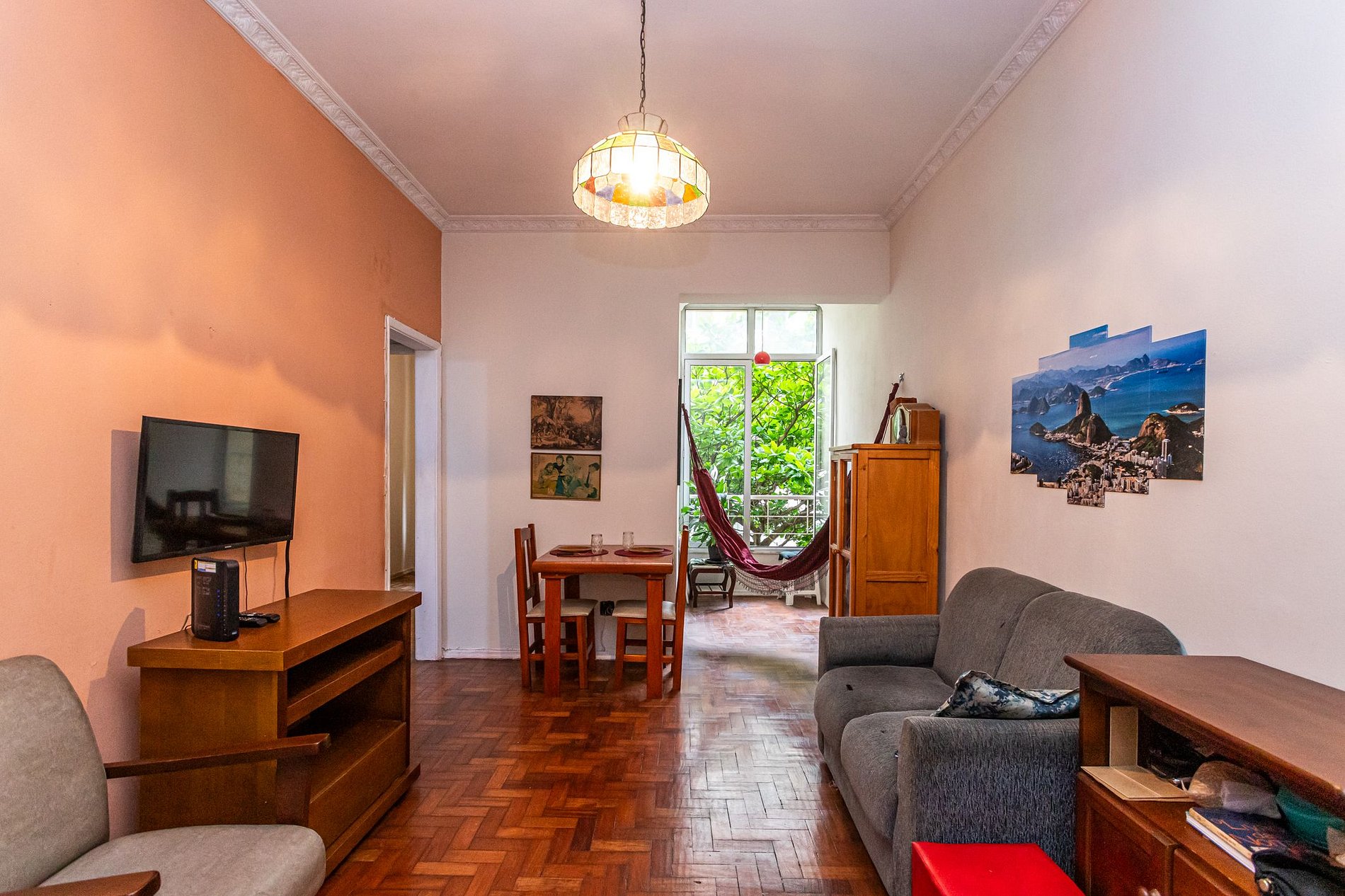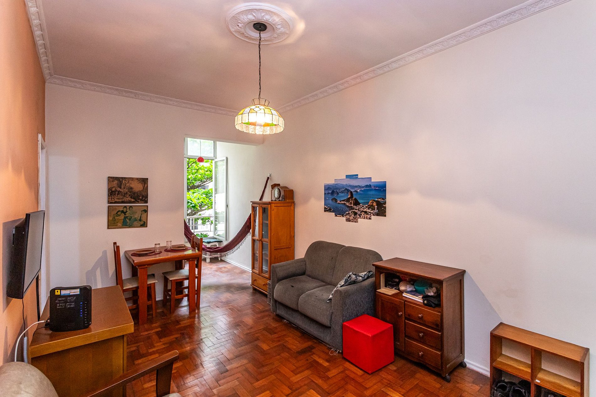 O quarto principal acomoda você em uma cama queen confortável, enquanto a sala dispõe de dois colchonetes práticos, permitindo que até quatro hóspedes desfrutem deste ambiente vintage onde a criatividade dos anos 80 ainda ecoa nas paredes altas de 3 metros de altura.A sala é o cenário perfeito para relaxar após um dia de sol, cercada pela copa das árvores que abraçam as janelas e garantem uma brisa constante.