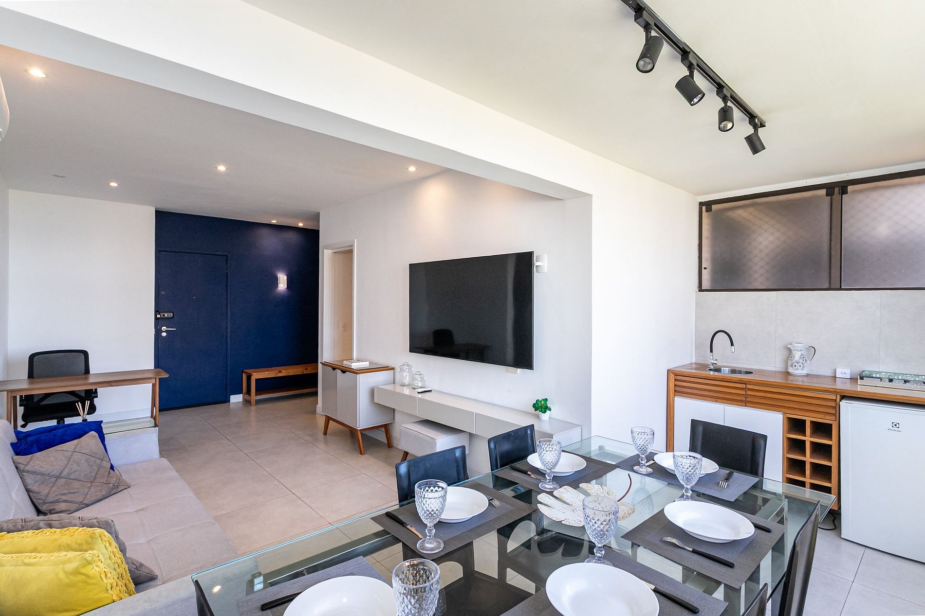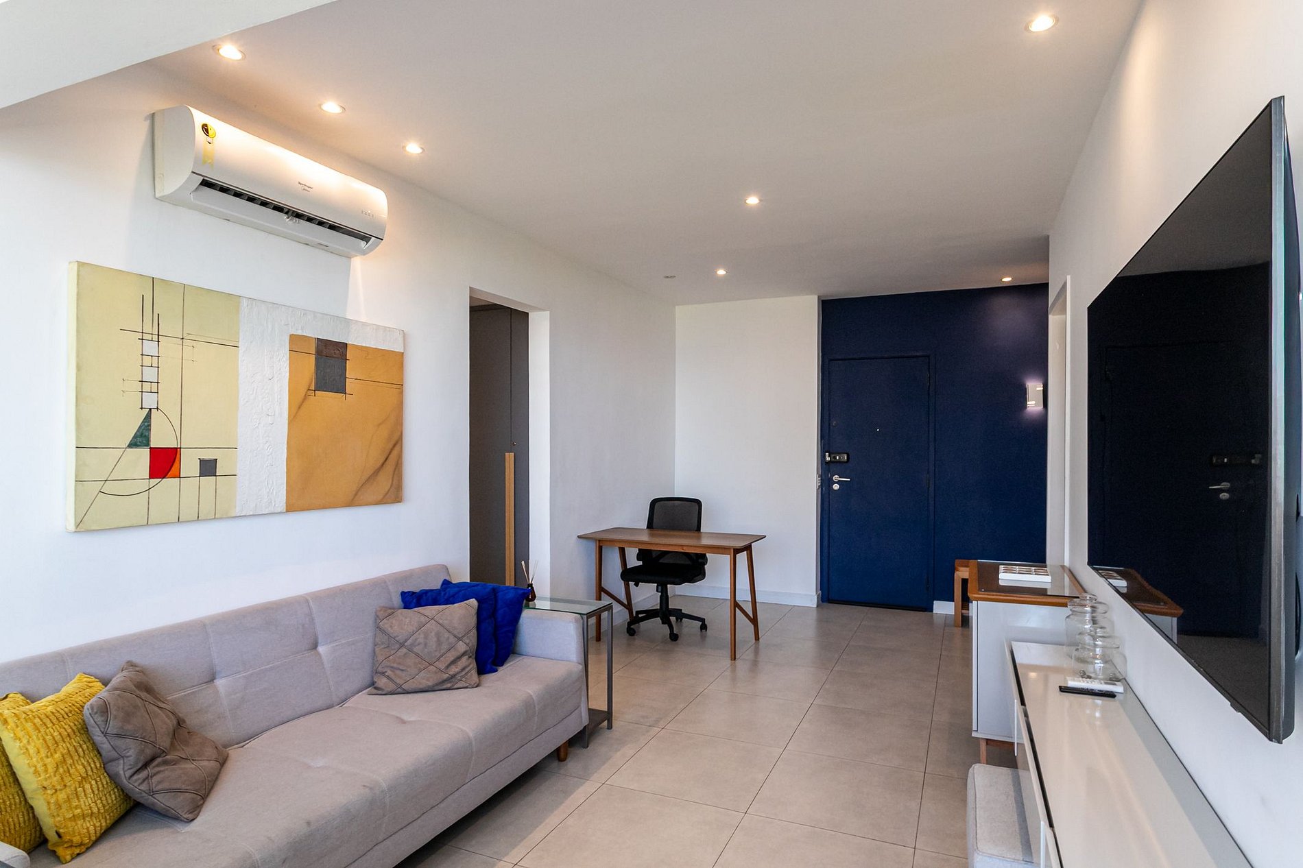 Conta com fechadura eletrônica, cama de casal, cama de solteiro, sofá-cama de casal na sala, roupas de cama e toalhas, ar-condicionado, TV, ventilador, cortinas blackout, ferro de passar, secador de cabelo, guarda-roupa, cabides, cozinha completa e água quente.