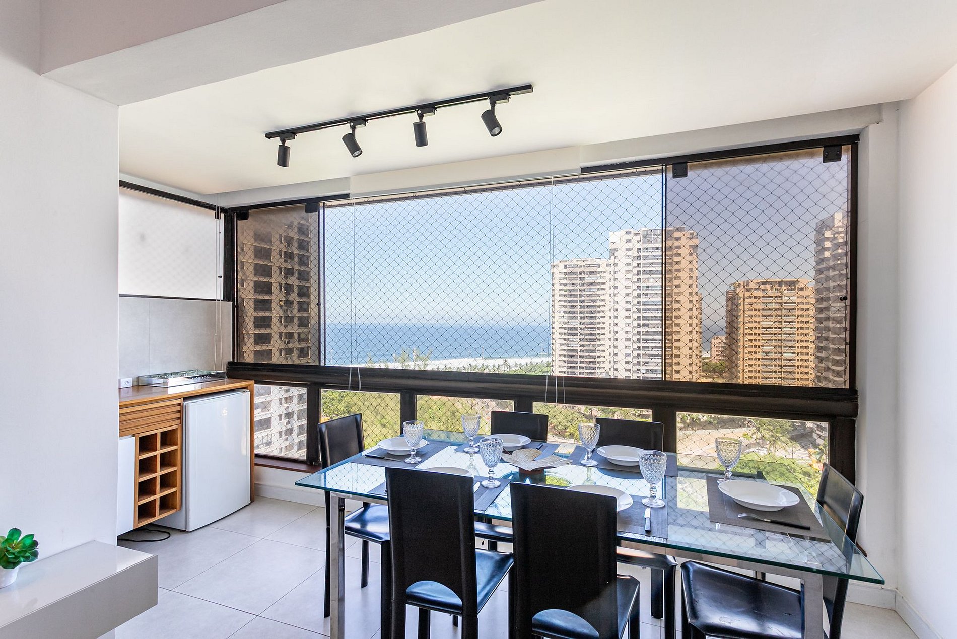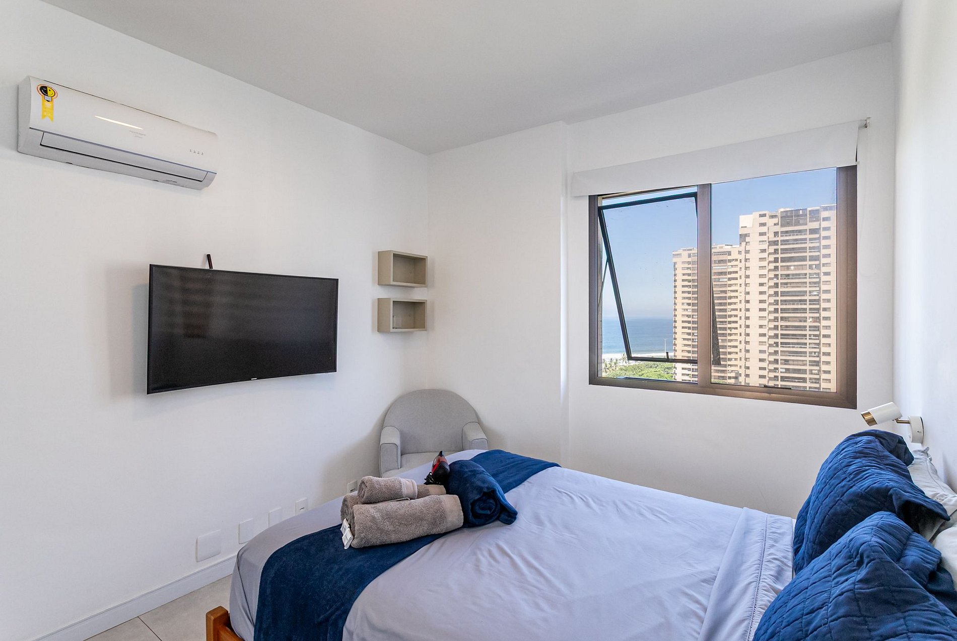 O apartamento dispõe de 2 quartos, 1 sala, 1 cozinha e 2 banheiros. Localizado no 10º andar, oferece vista frontal para a praia da Barra da Tijuca. É só atravessar a rua para chegar à praia!