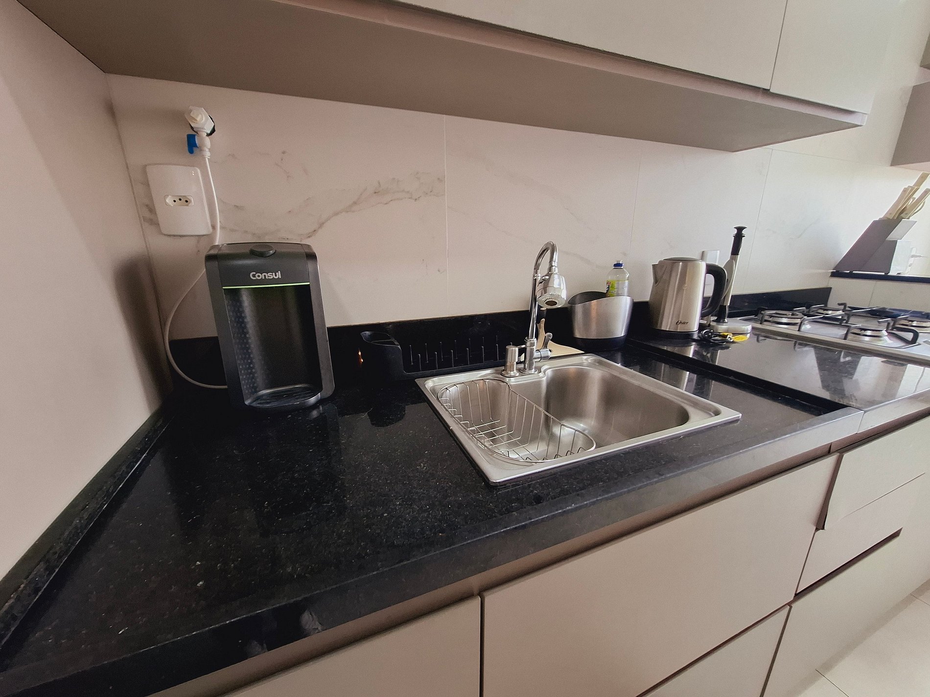 Fechadura eletrônica, cama casal e de solteiro, sofá cama casal na sala, roupa de cama e toalhas, ar condicionado, TV, ventilador, cortinas blackout, ferro de passar, secador de cabelo, guarda-roupa, cabides, sofá cama, cozinha completa, água quente.