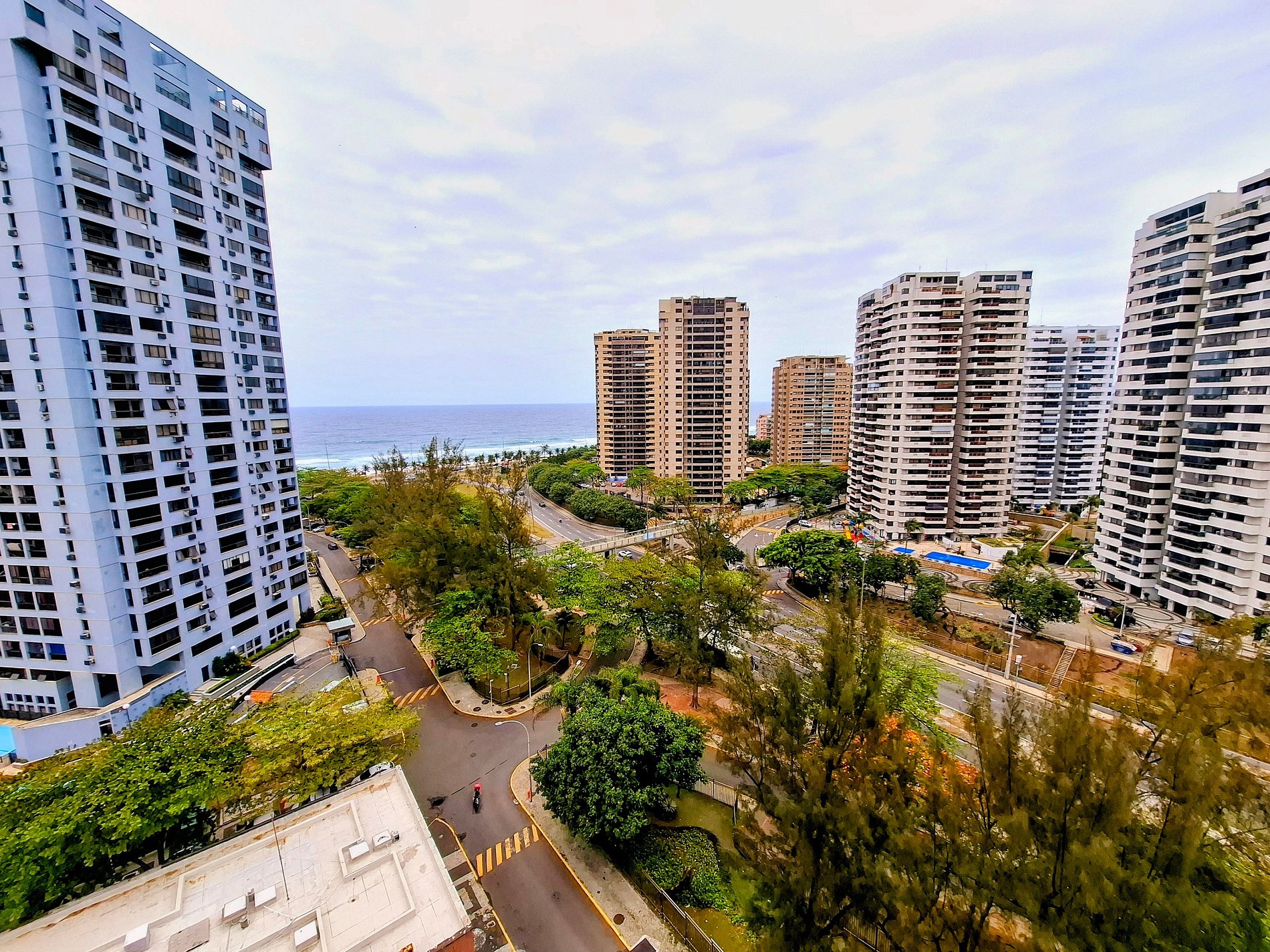 O apartamento é dividido em 2 quartos, 1 sala, 1 cozinha e 2 banheiros, com vista frontal, fica no 10º andar e Com uma vista de frente para praia da Barra da Tijuca, só atravessar!