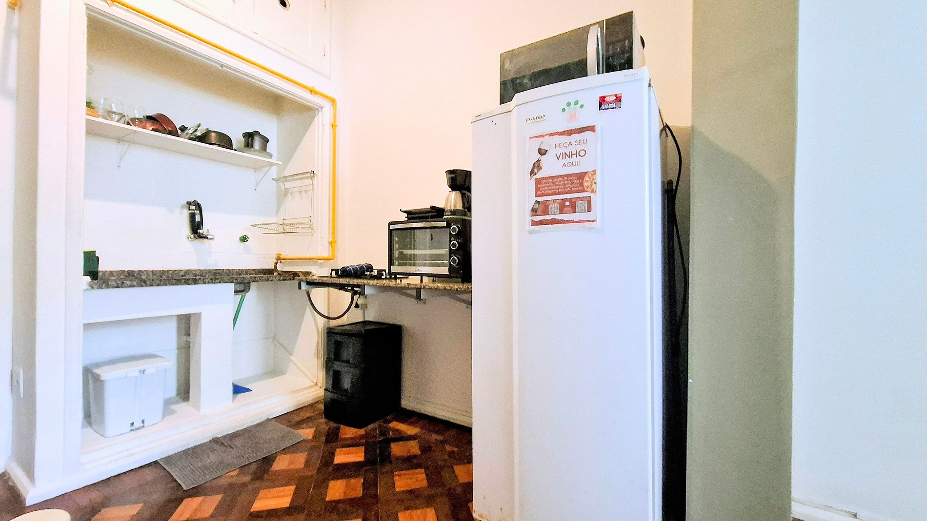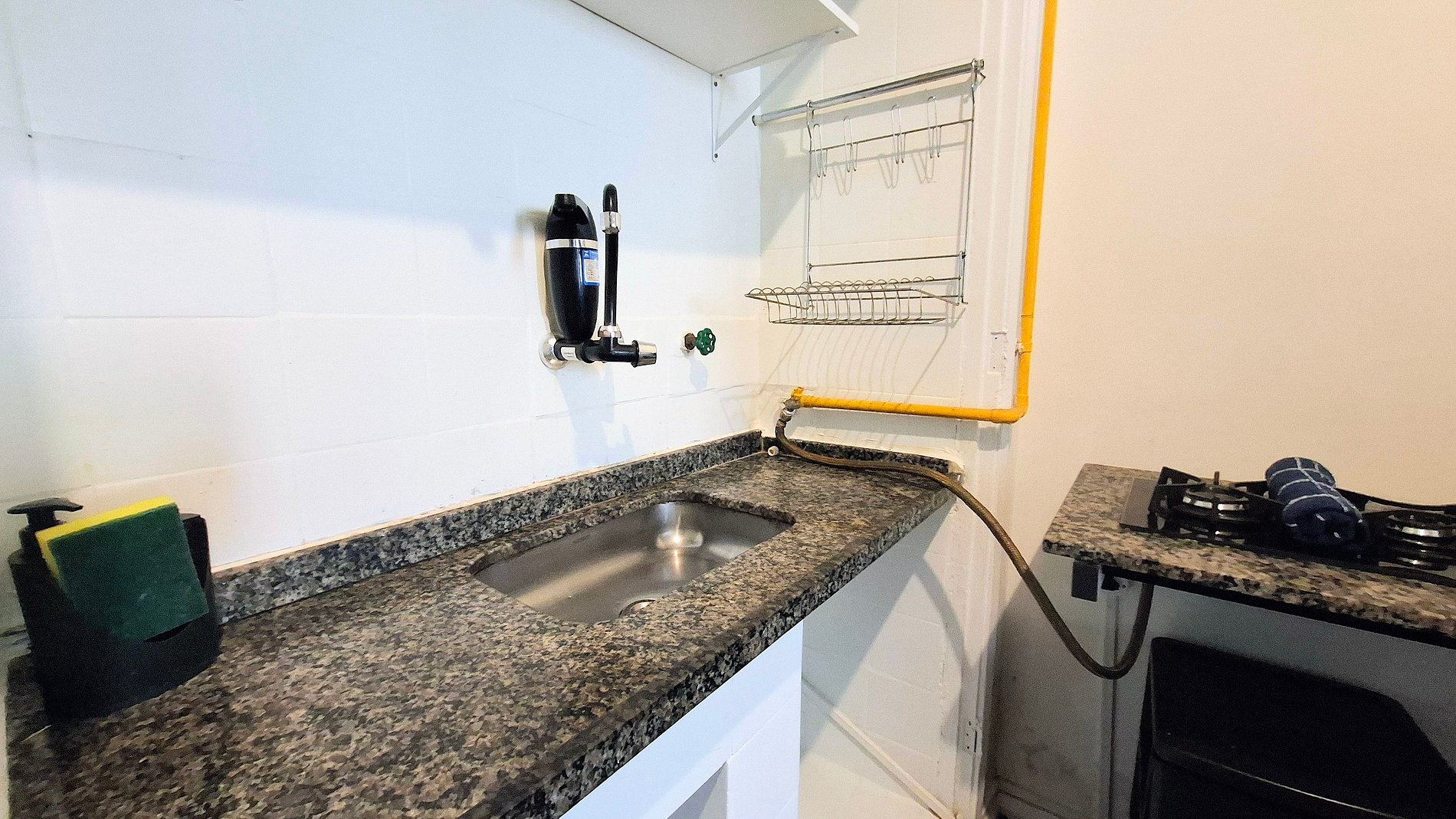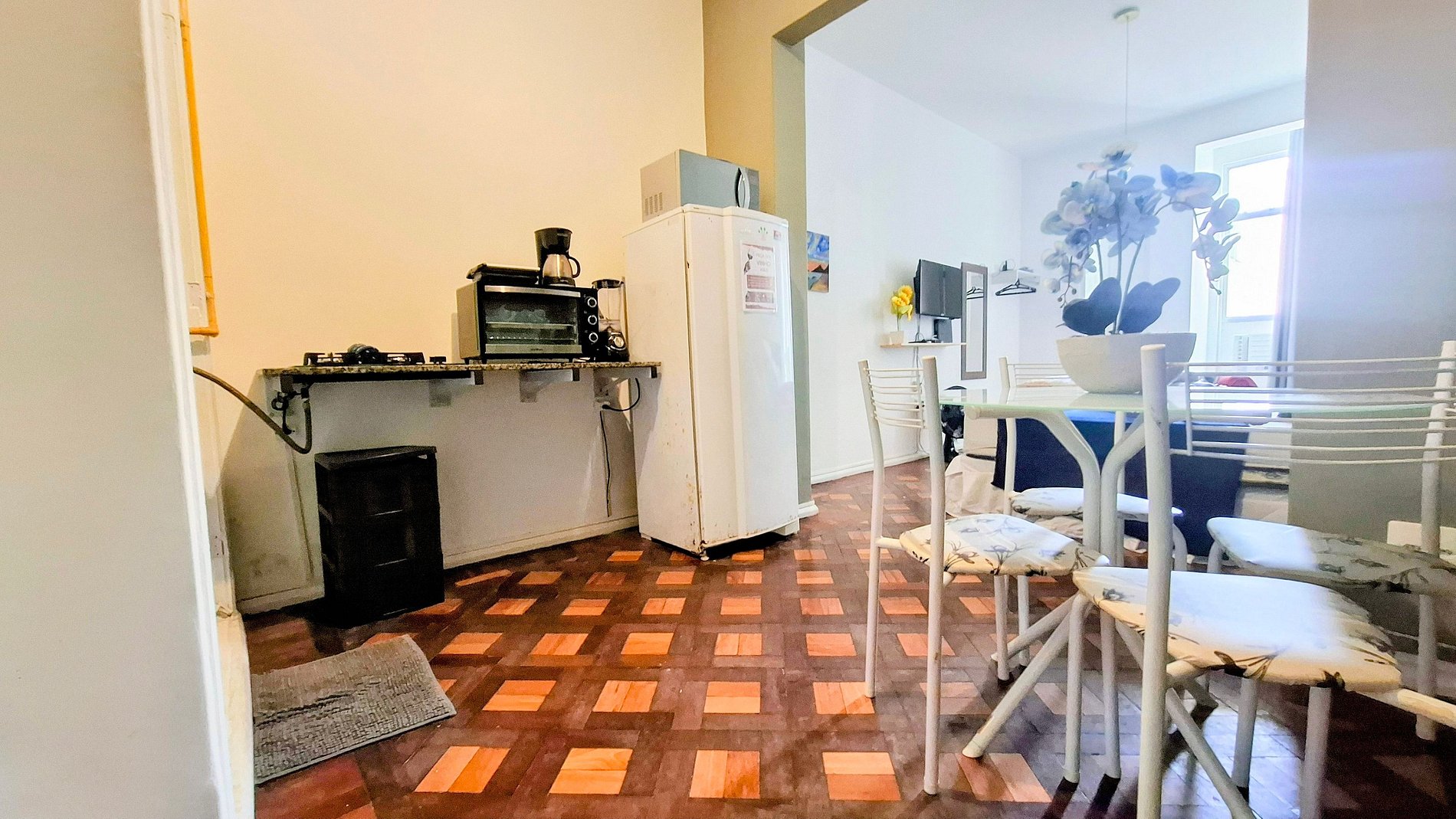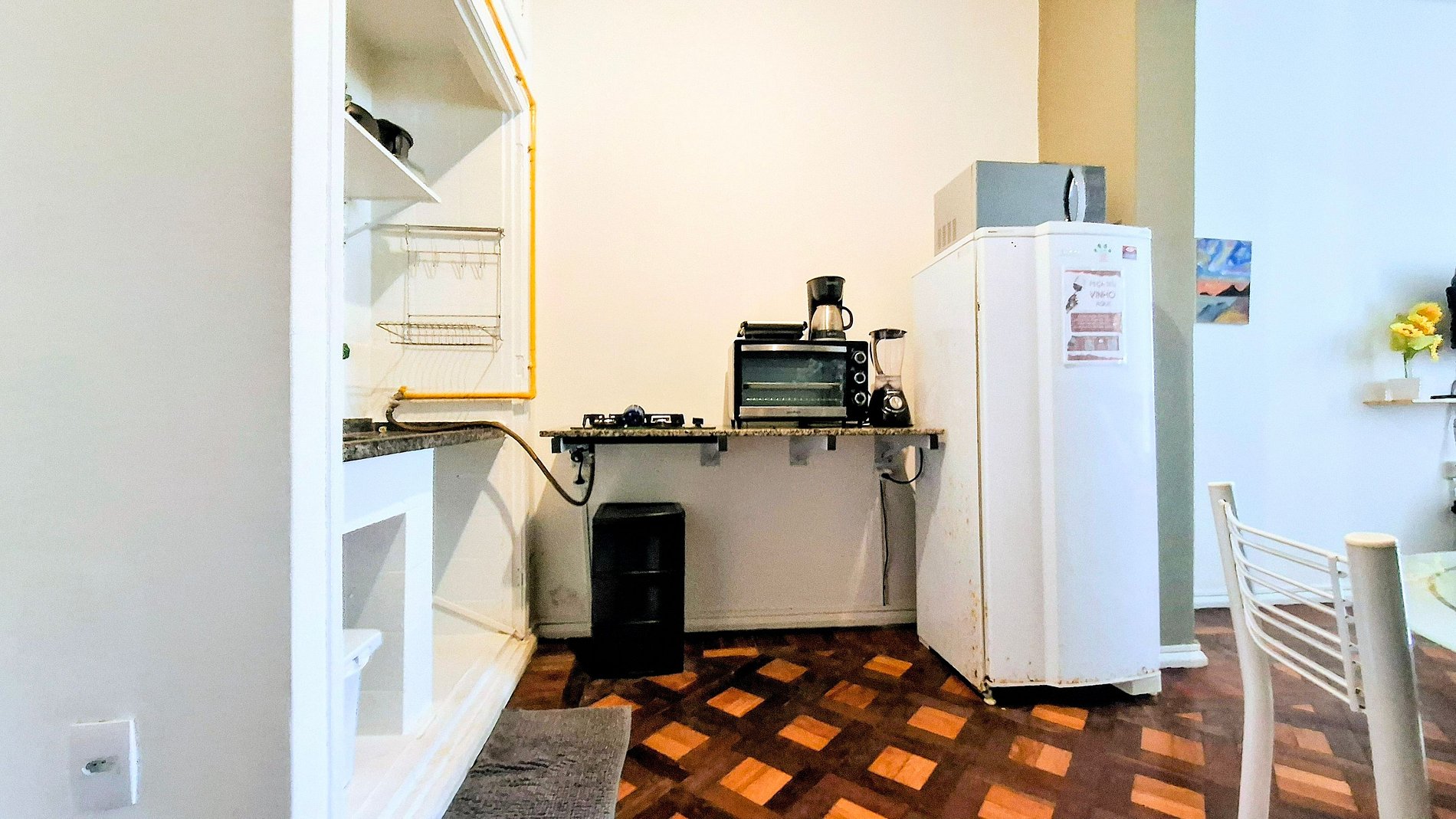 A sala de estar é conjugada com o quarto, com smart tv para séries leves e uma mesinha para lanches improvisados, enquanto a cozinha, equipada com cook-top, forninho elétrico e micro-ondas, transforma idas ao mercado em aventuras culinárias descomplicadas.