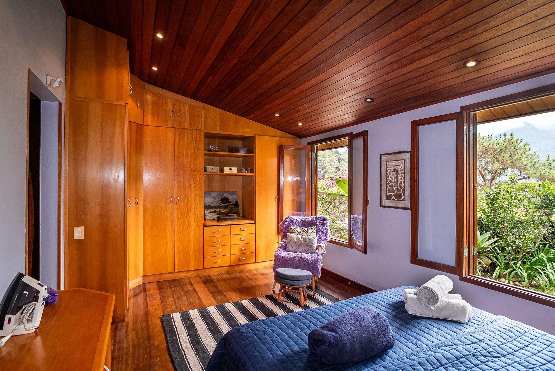 Com ambientes amplos, arejados e cheios de personalidade, a casa acomoda até 4 pessoas com muito carinho. São 2 quartos com camas de casal, além de um colchão inflável de casal e outro de solteiro (basta avisar se precisar!). A decoração une toques rústicos, arte e charme serrano — como a poltrona lilás no cantinho de leitura, as esculturas artesanais no banheiro ou a janela do quarto com vista para o jardim e montanhas.