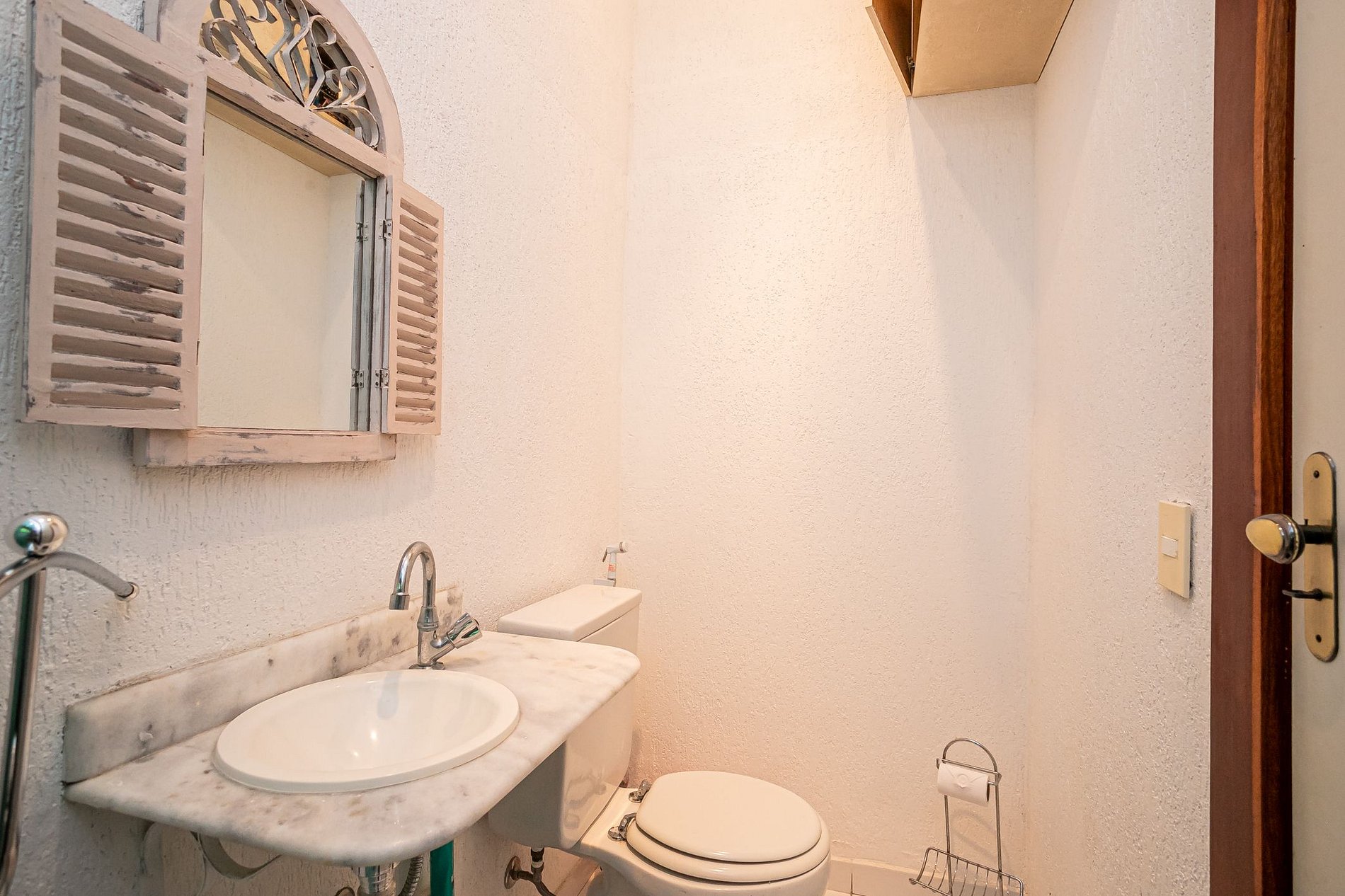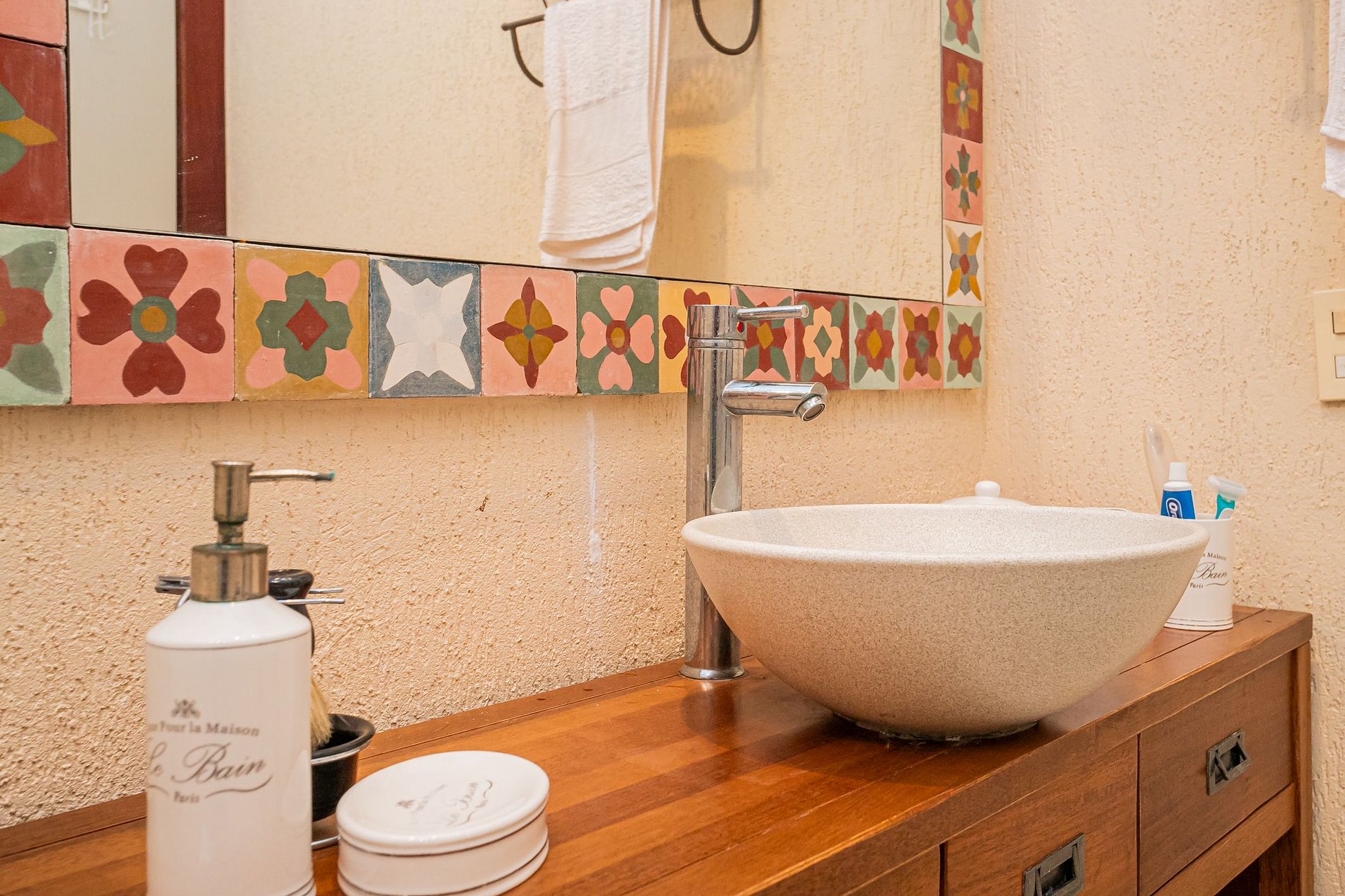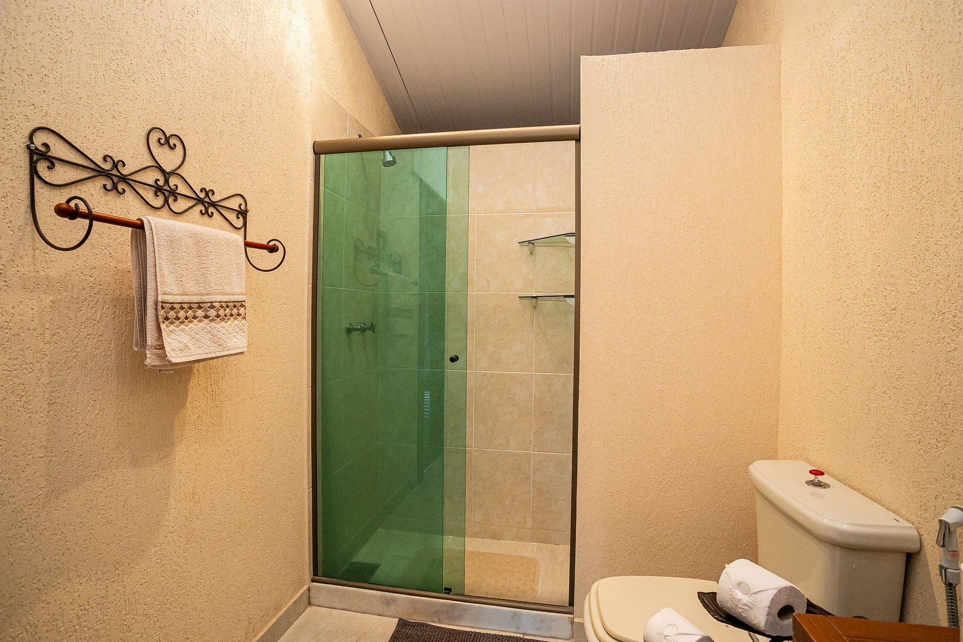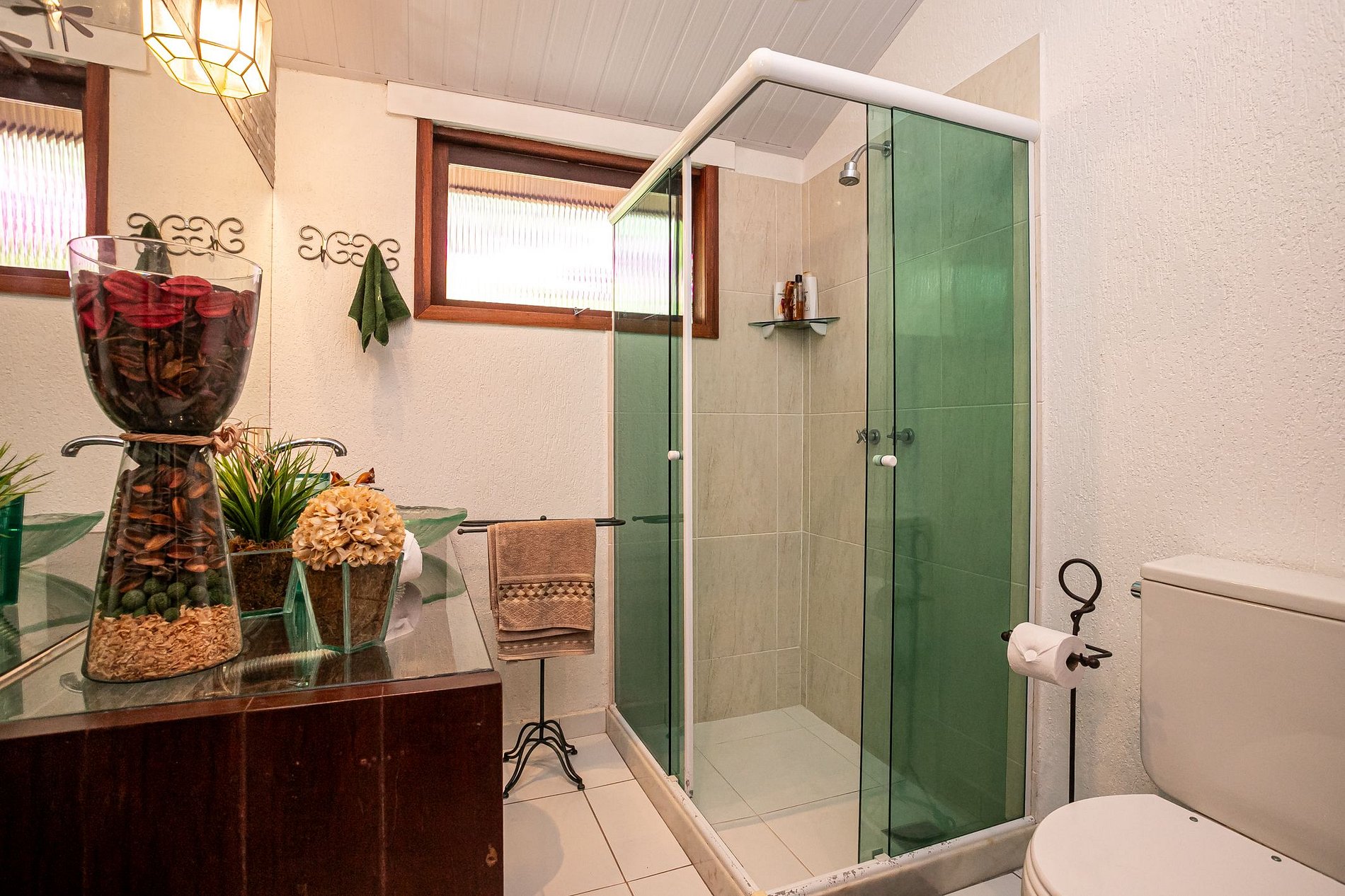 São 3 banheiros completos, todos bem iluminados e com ventilação natural. O banheiro principal tem pia de vidro, detalhes em madeira e um toque afetivo que reforça a sensação de cuidado. Todos são super bem equipados!