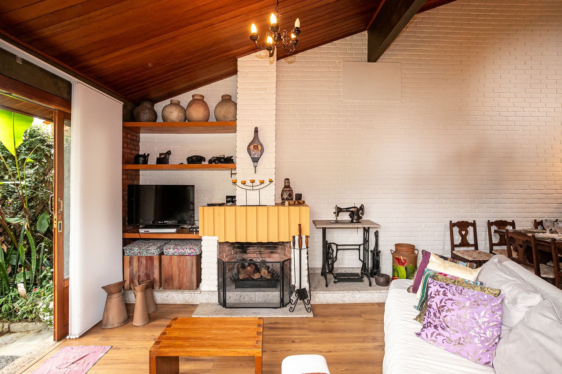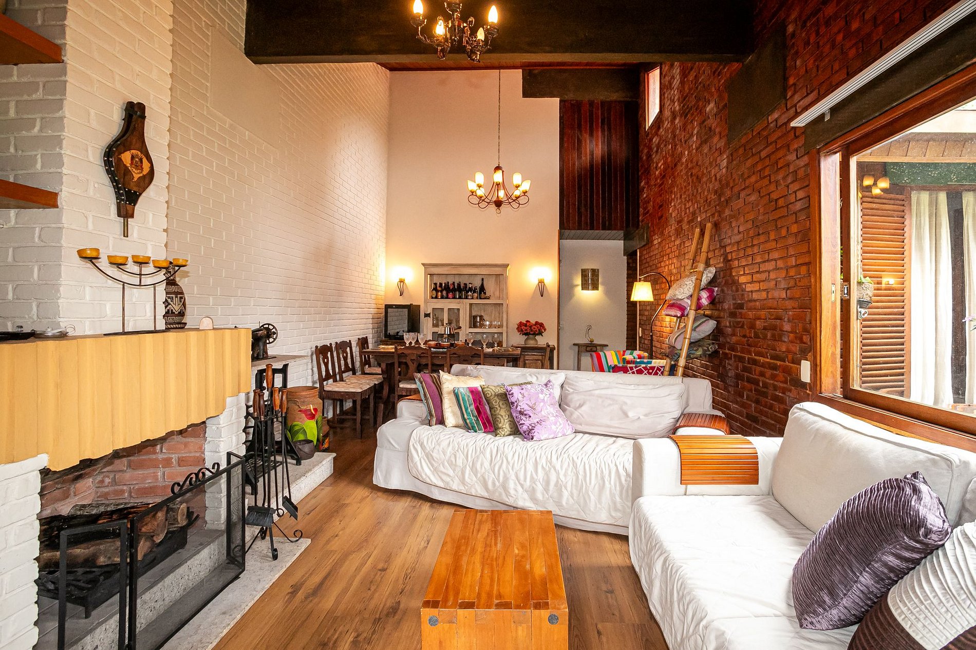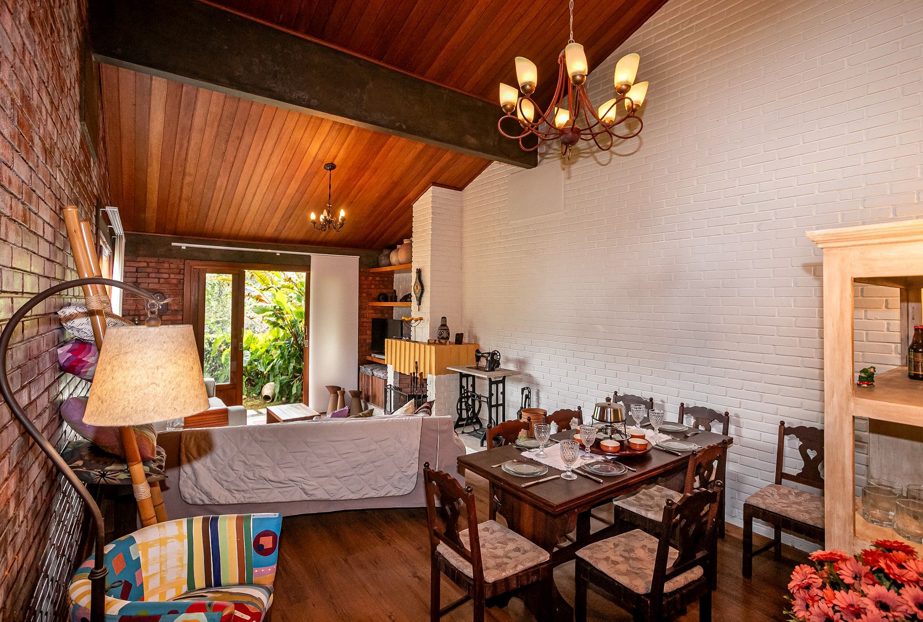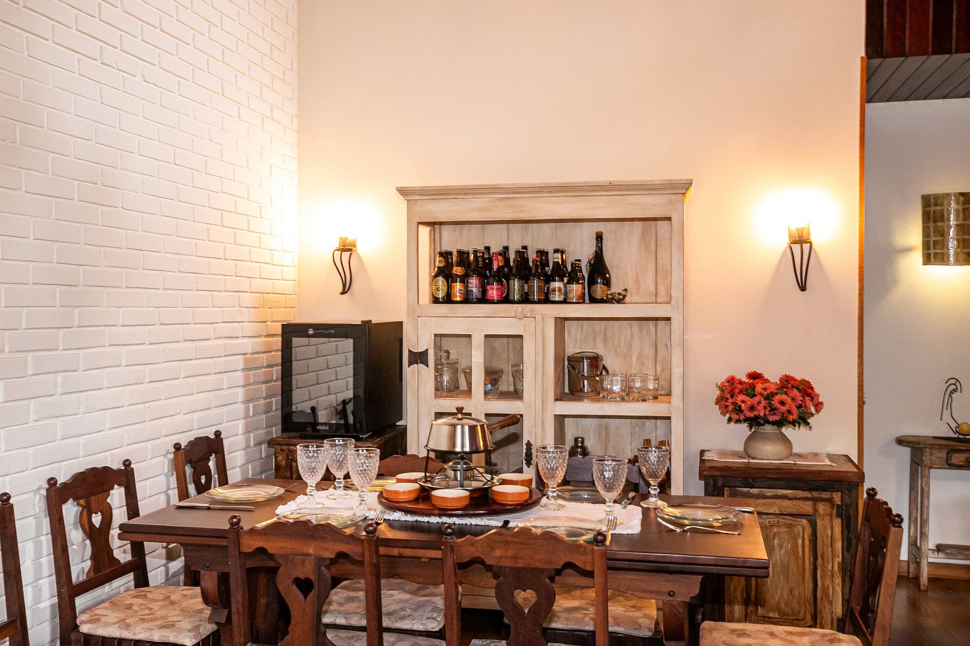 A sala de jantar reúne tudo que importa: uma mesa de madeira robusta, cadeiras com encosto vazado em coração, cristaleira charmosa e iluminação suave. É o cenário ideal para fondue nas noites frias ou cafés da manhã preguiçosos com vista para o verde.
