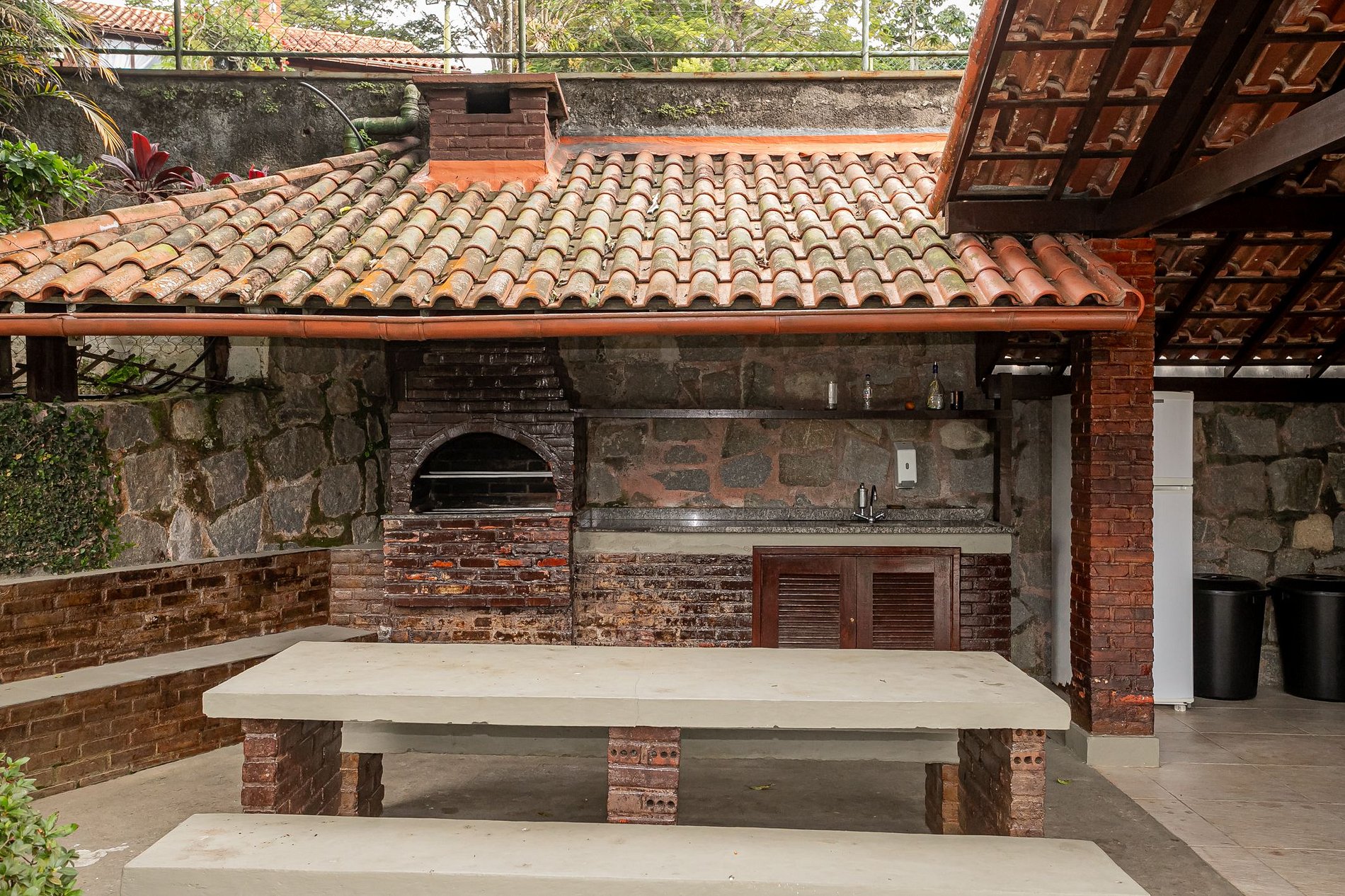 A área gourmet é um charme à parte: uma varanda coberta com forno a lenha, bancada espaçosa, geladeira e uma mesa rústica de alvenaria que acomoda toda a família. Ideal para um churrasco ao pôr do sol ou almoços descontraídos nos dias frios. O estilo rústico com tijolinhos aparentes e madeira aparente dá um ar de casa de campo, com muito conforto.