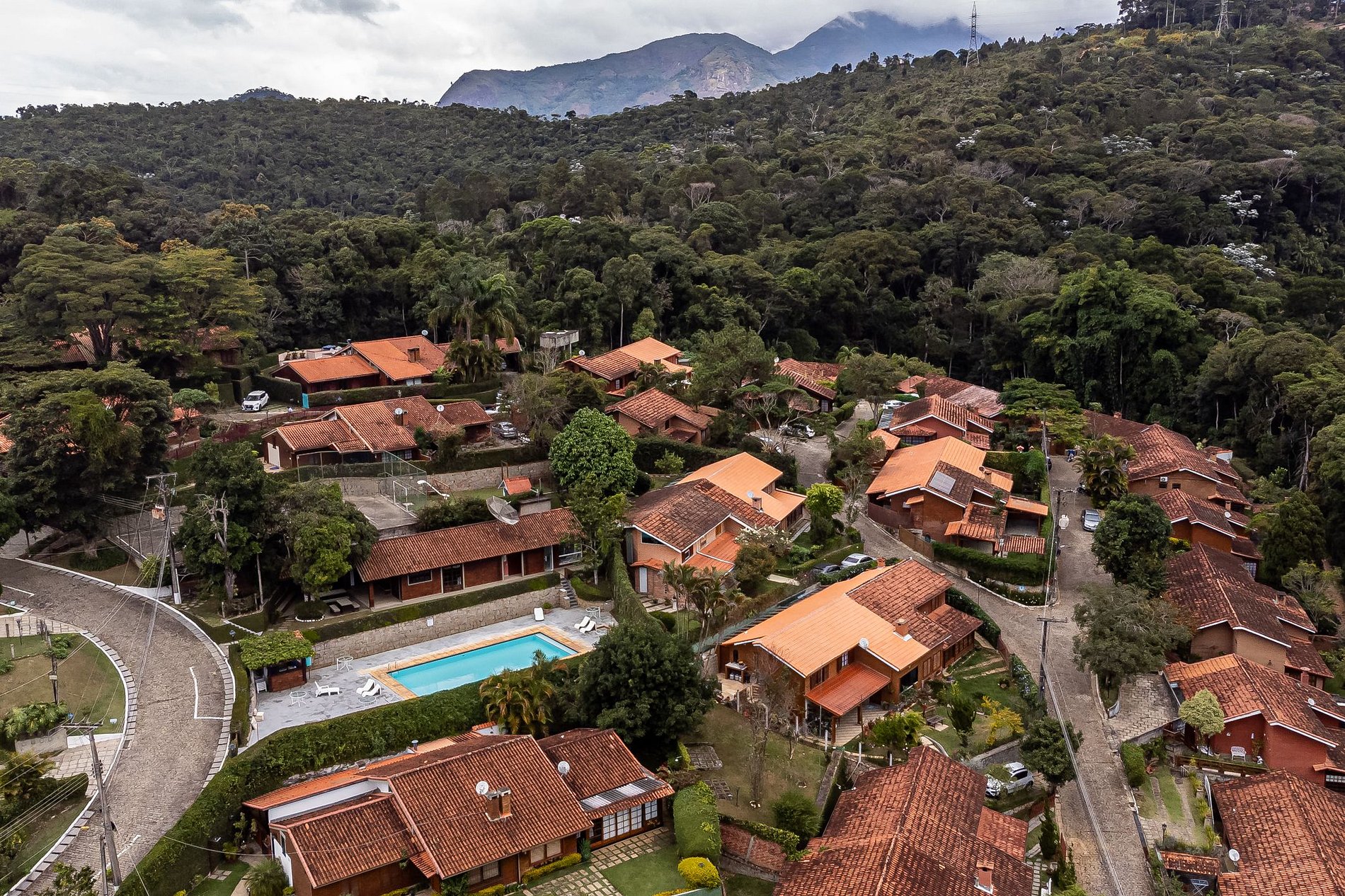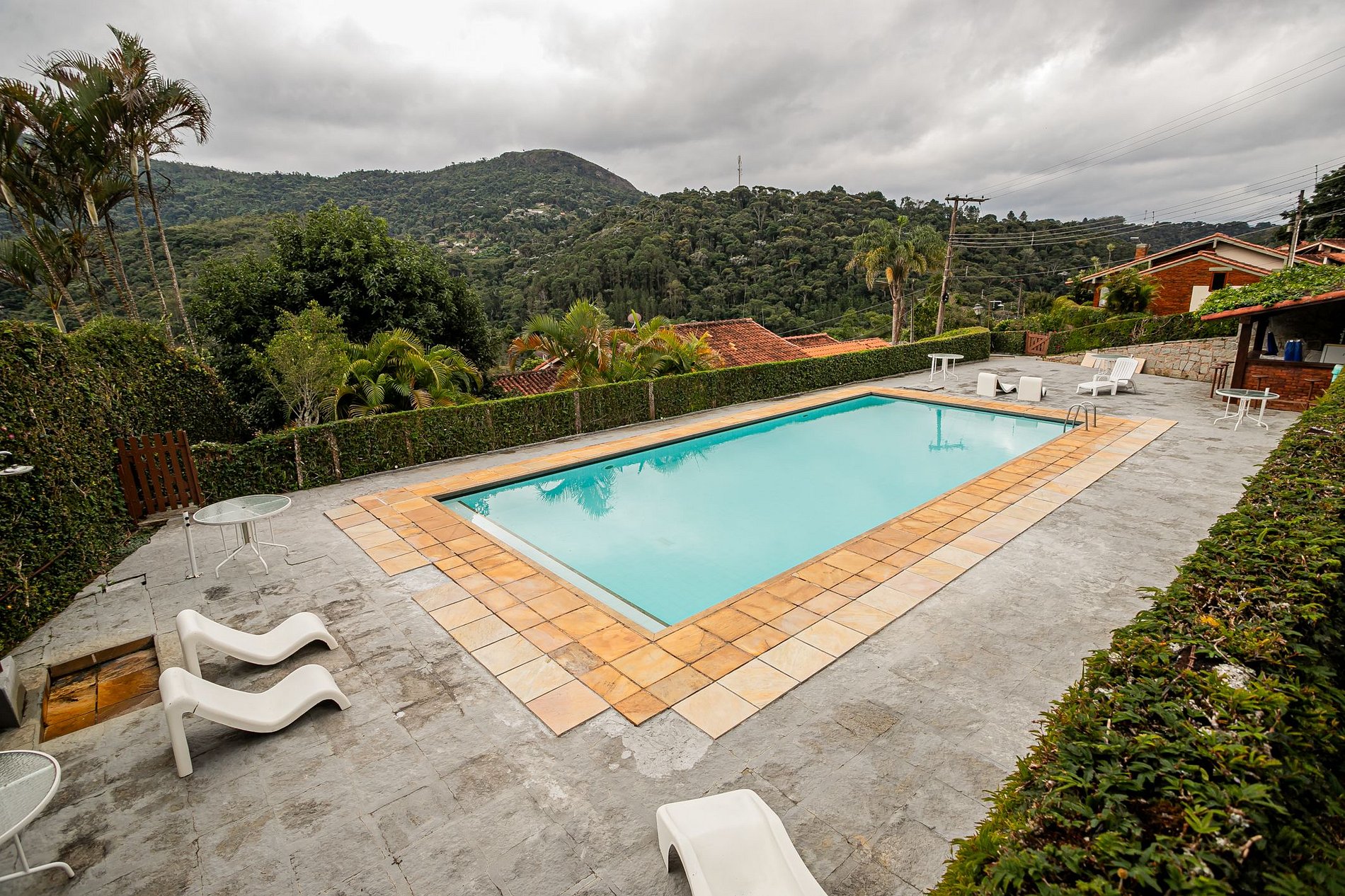 A piscina é um verdadeiro espetáculo: ampla, com bordas claras, espreguiçadeiras, mesas e uma vista panorâmica da mata. Um espaço perfeito para tomar sol, relaxar, ler um livro ou apenas contemplar as montanhas. O ambiente ainda conta com apoio de bar e área de convivência coberta.