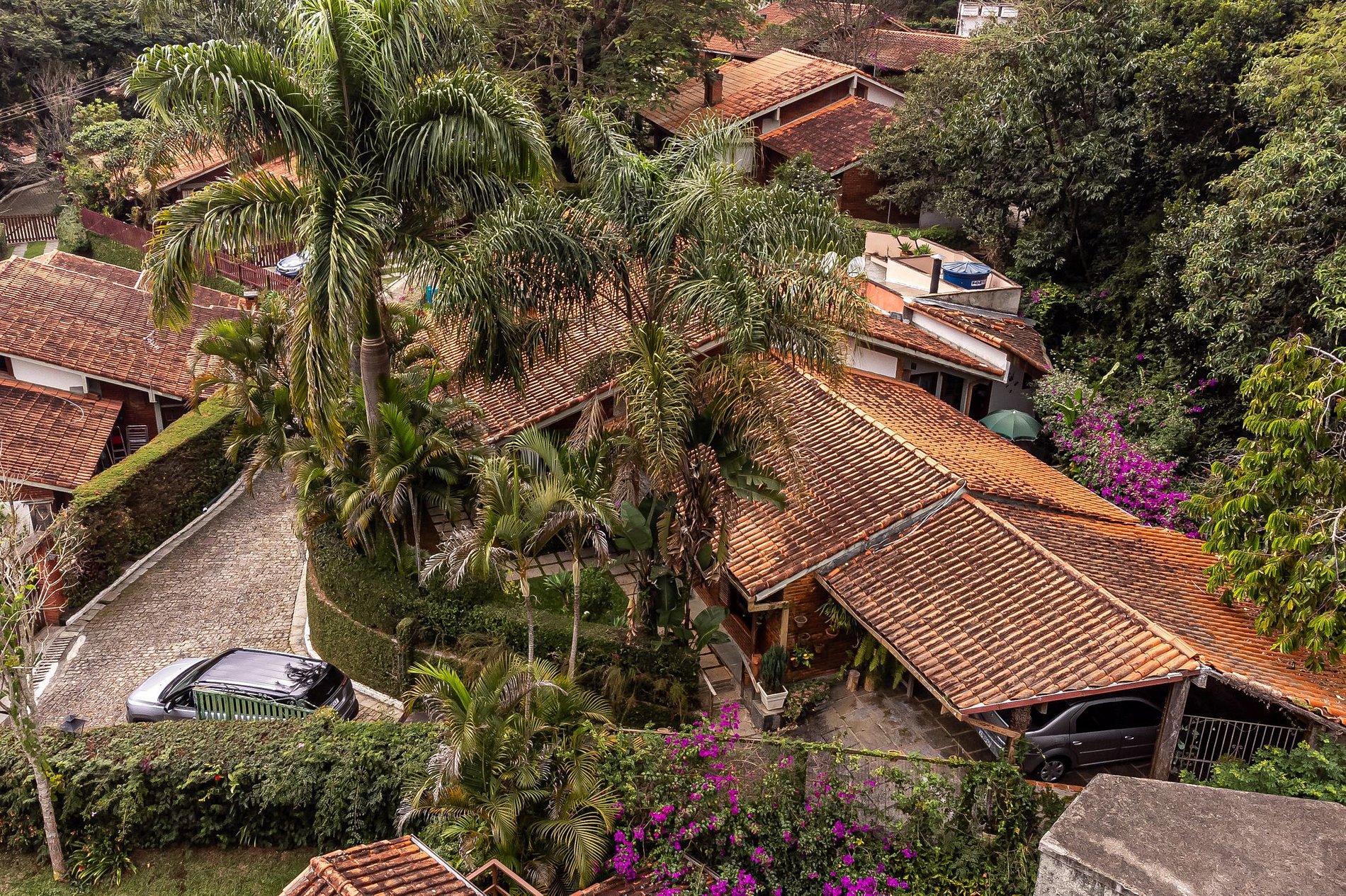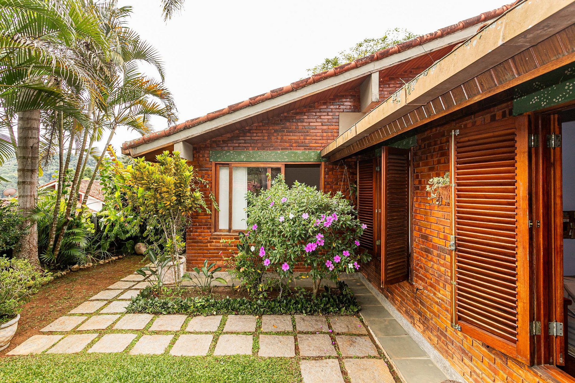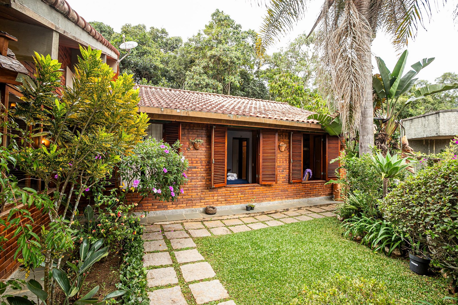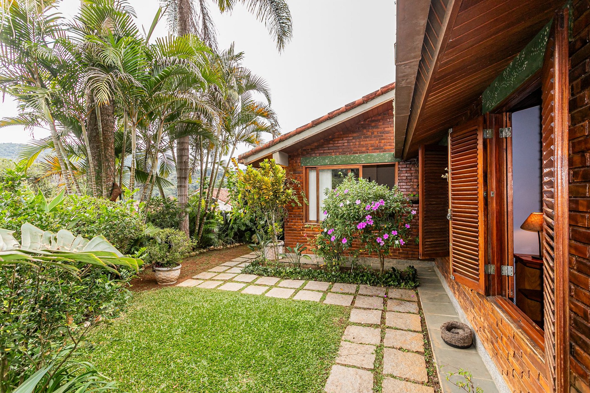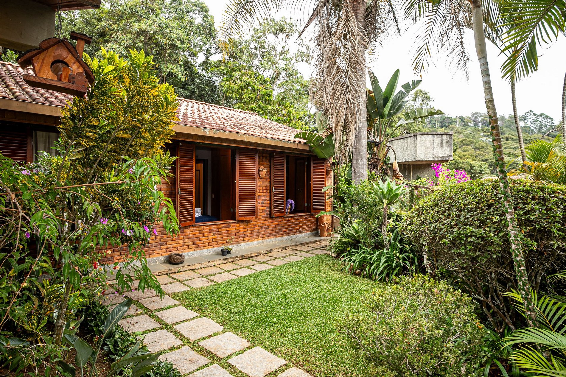 Na lateral da casa, um pátio encantador se abre como uma pequena praça particular. Um jardim com flores vibrantes, mesa com guarda-sol e cadeiras confortáveis compõem o cenário perfeito para um café da manhã ao ar livre, uma taça de vinho no fim do dia ou simplesmente para ouvir os pássaros. A vegetação exuberante e o paisagismo bem cuidado criam uma moldura de acolhimento e serenidade.