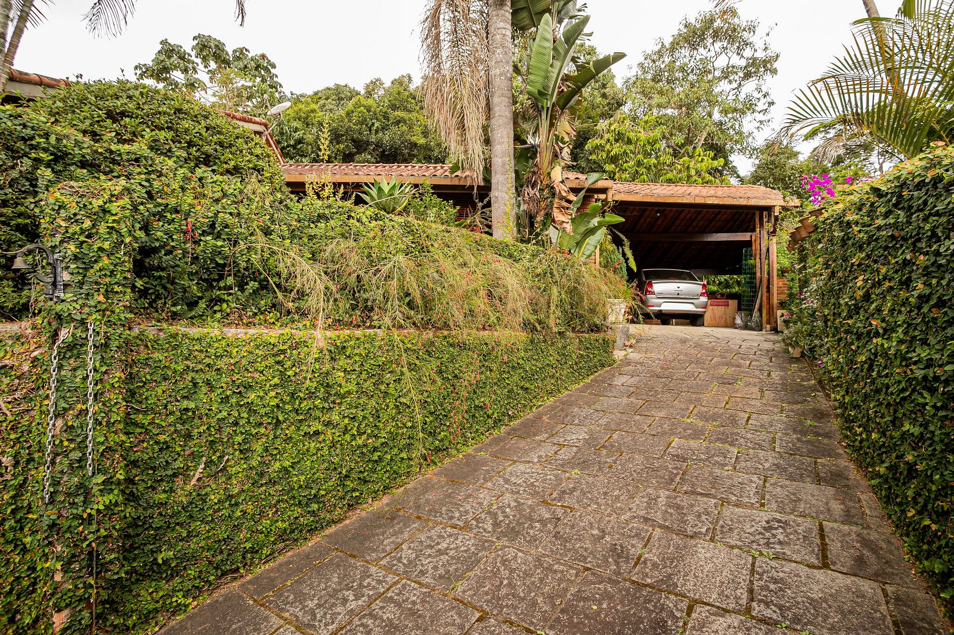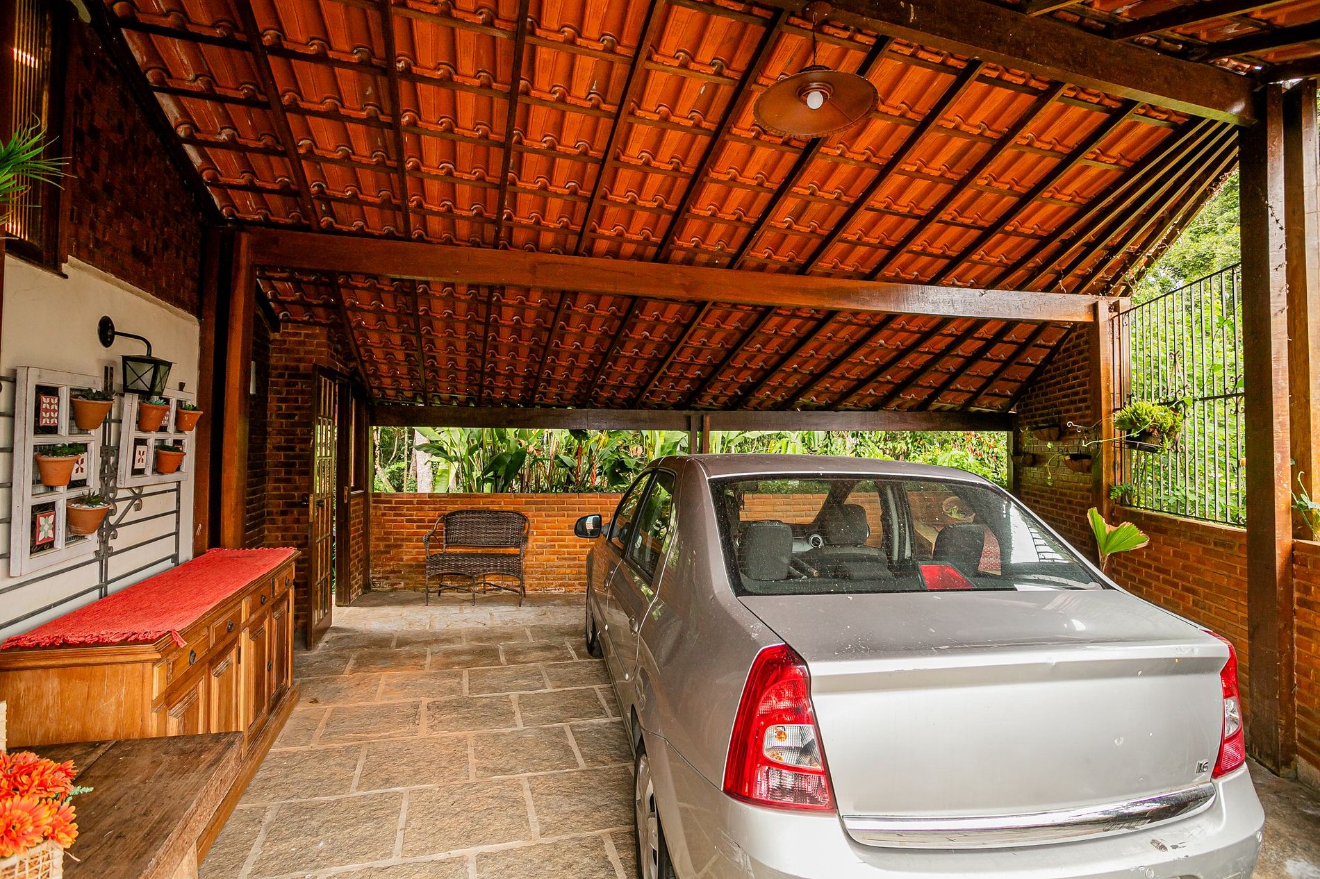A garagem coberta comporta dois carros e tem fácil acesso à entrada principal. É espaçosa, segura e cercada por plantas e bancos de madeira — já com aquele ar de descanso que convida a desligar do ritmo da cidade.
